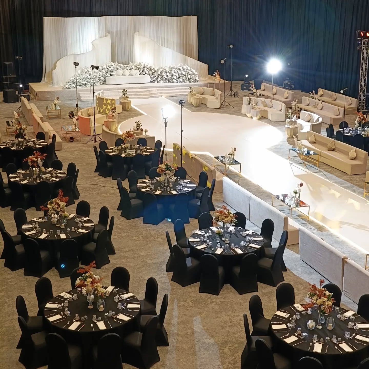 ديكورات القاعة مودرن وعصرية، تعطي إحساس بالفخامة والراحة، مع توزيع ذكي للمساحات يضمن سهولة الحركة وتنظيم مثالي للحفل. القاعة مناسبة للأعراس، حفلات الخطوبة، التخرج، والمناسبات العائلية، وتلبي مختلف الأذواق.