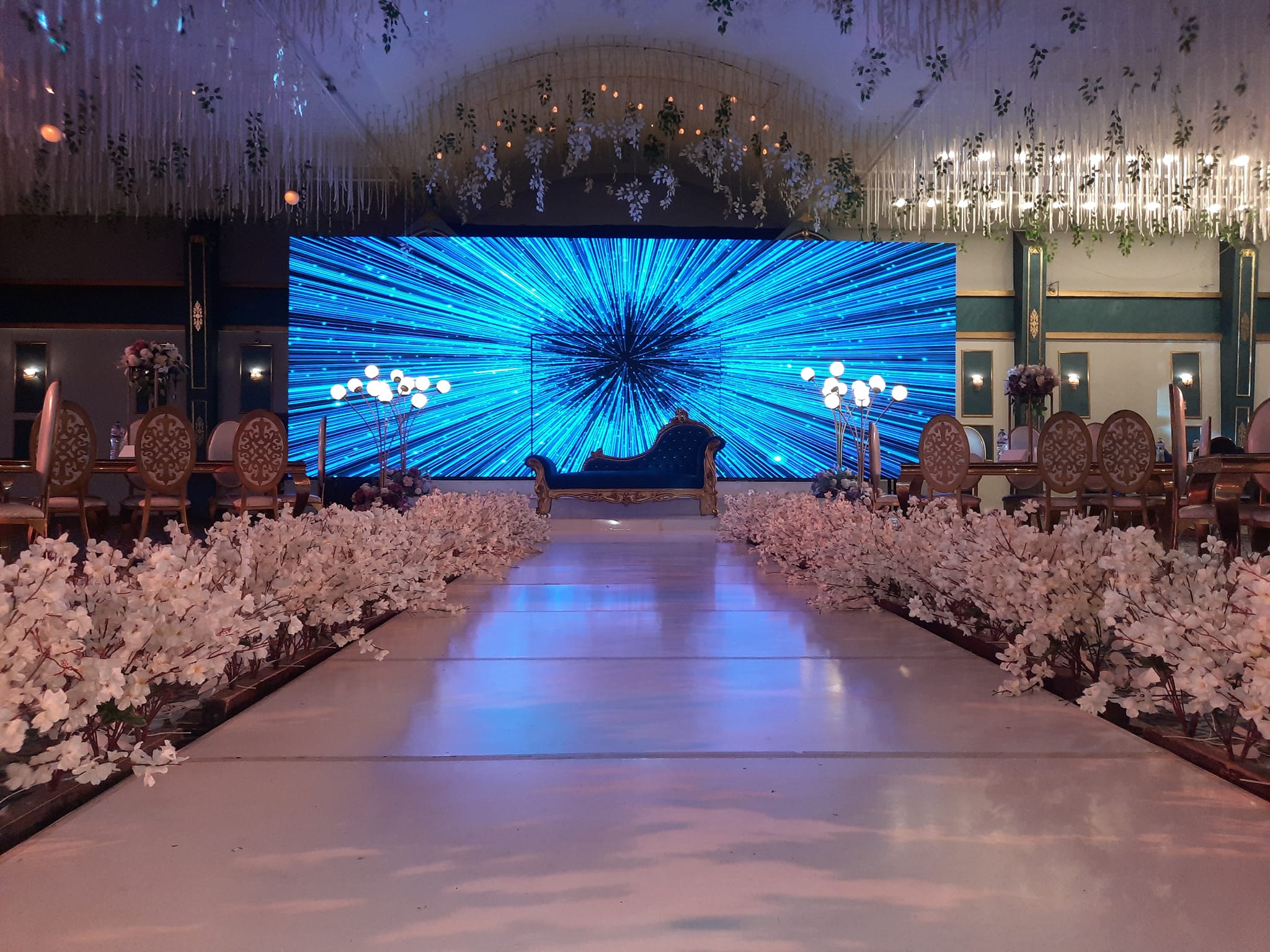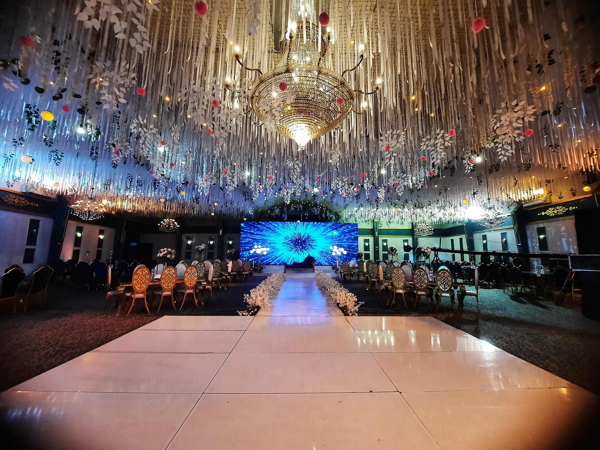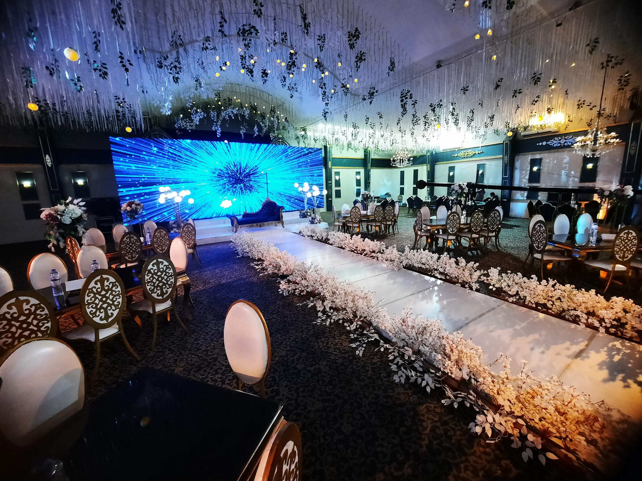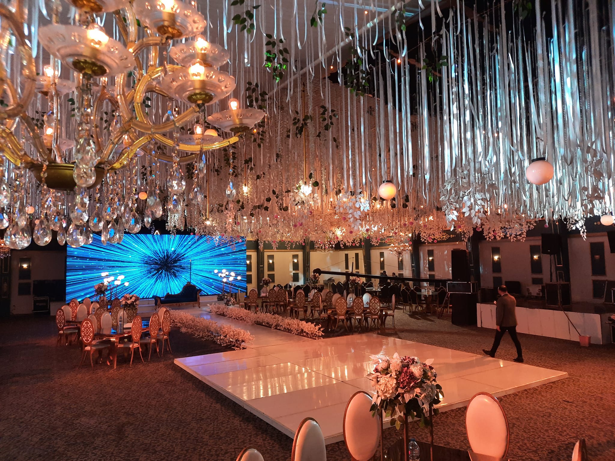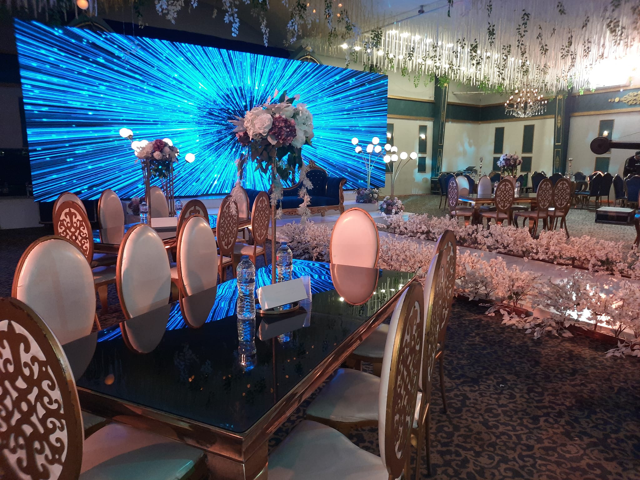 (الديكور – الكوشة –اجهزة الليزر – المنيو – دي جي – الزفة –سنتر بيس –دانس فلور مضئ – فيديو )
