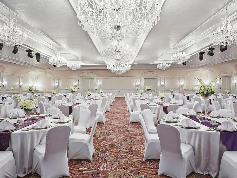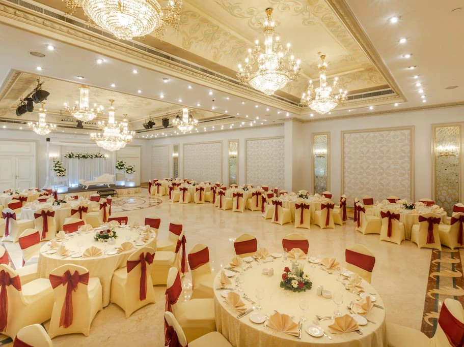 قاعة الزفاف الداخلي في فندق الماسة القاهرة تمثل الفخامة في أبهى صورها، حيث تجمع بين المساحات الواسعة والديكورات العصرية المصممة خصيصًا لتليق بأهم المناسبات. القاعة مجهزة بالكامل لاستقبال حفلات الزفاف الكبيرة، بما يضمن للعرسان ليلة لا تُنسى وسط أجواء راقية.