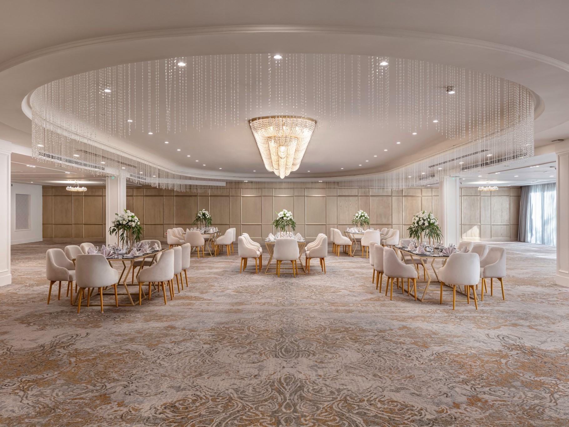 توفر قاعة الزفاف الداخلية أجواء راقية مصممة لتكون مثالية لأجمل المناسبات.