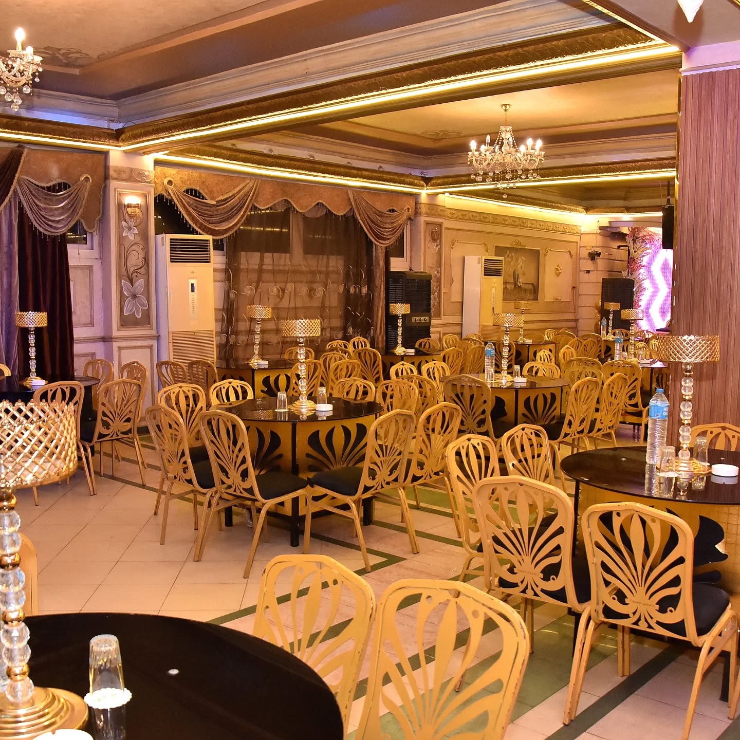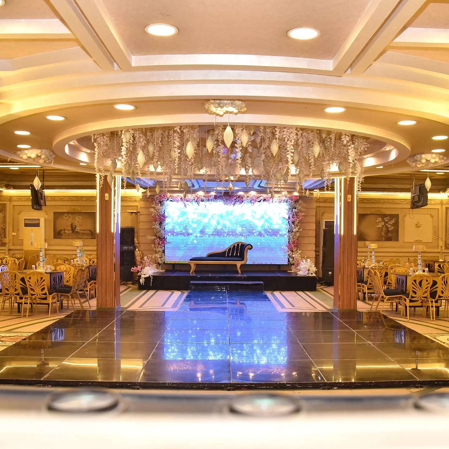 القاعة بتتسع لحد 400 فرد، وده بيخليها مناسبة للأفراح الكبيرة والتجمعات العائلية الضخمة، مع تصميم فاخر يجمع بين الفخامة والراحة في نفس الوقت.
