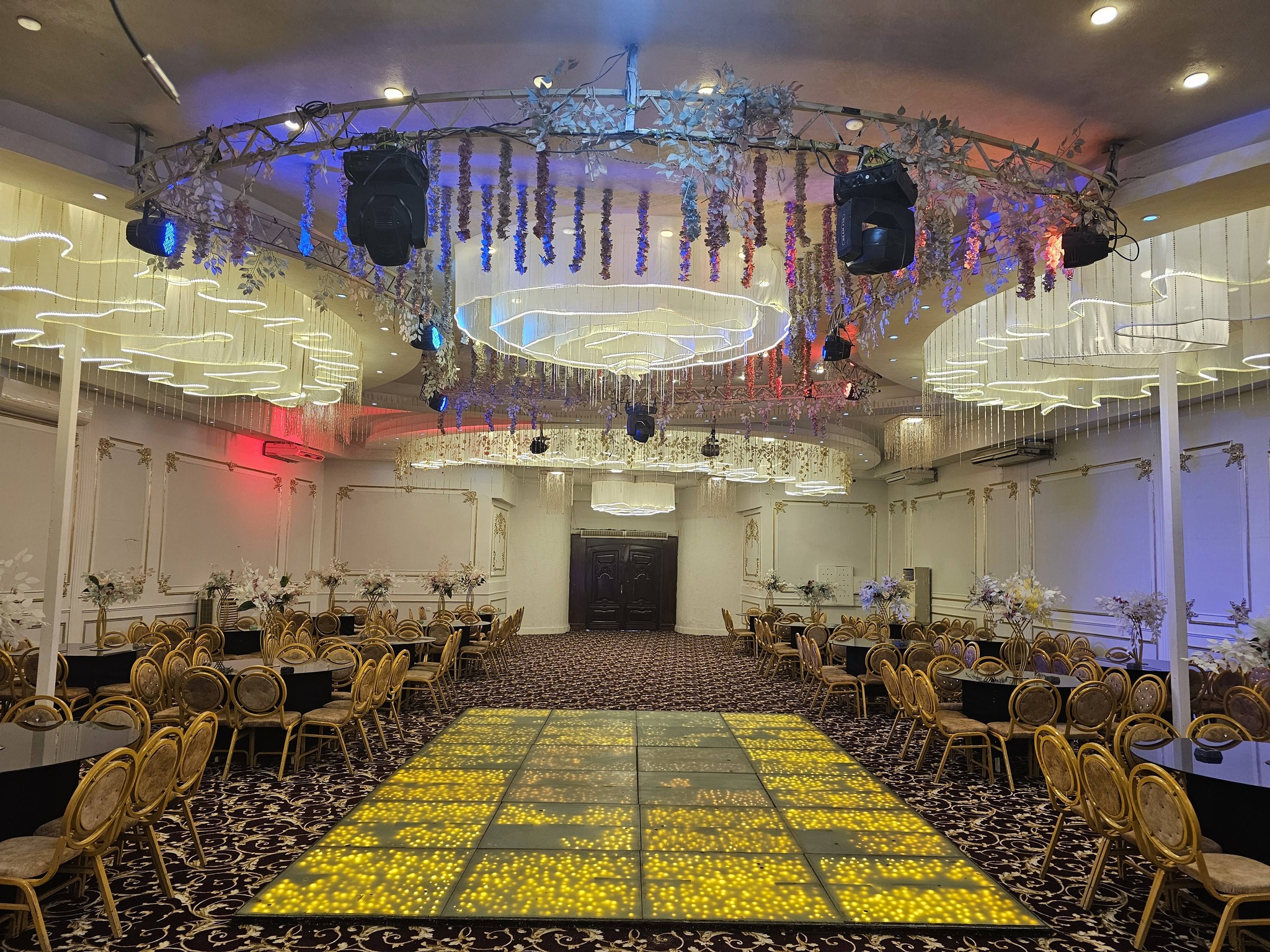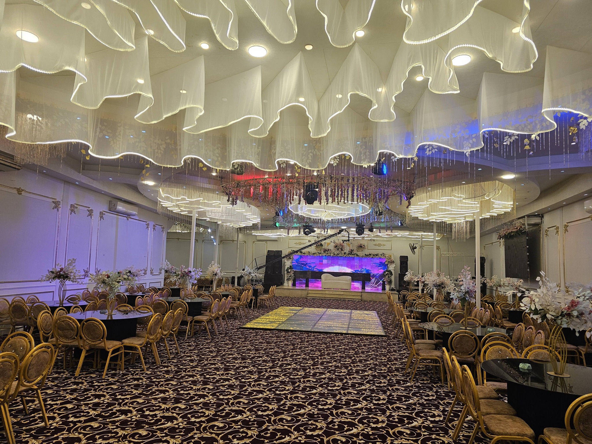 The hall is equipped to accommodate large weddings, engagement parties, marriage contract ceremonies, and conferences, with proper organization and complete service—from the moment the couple enters until the very last minute of the event.