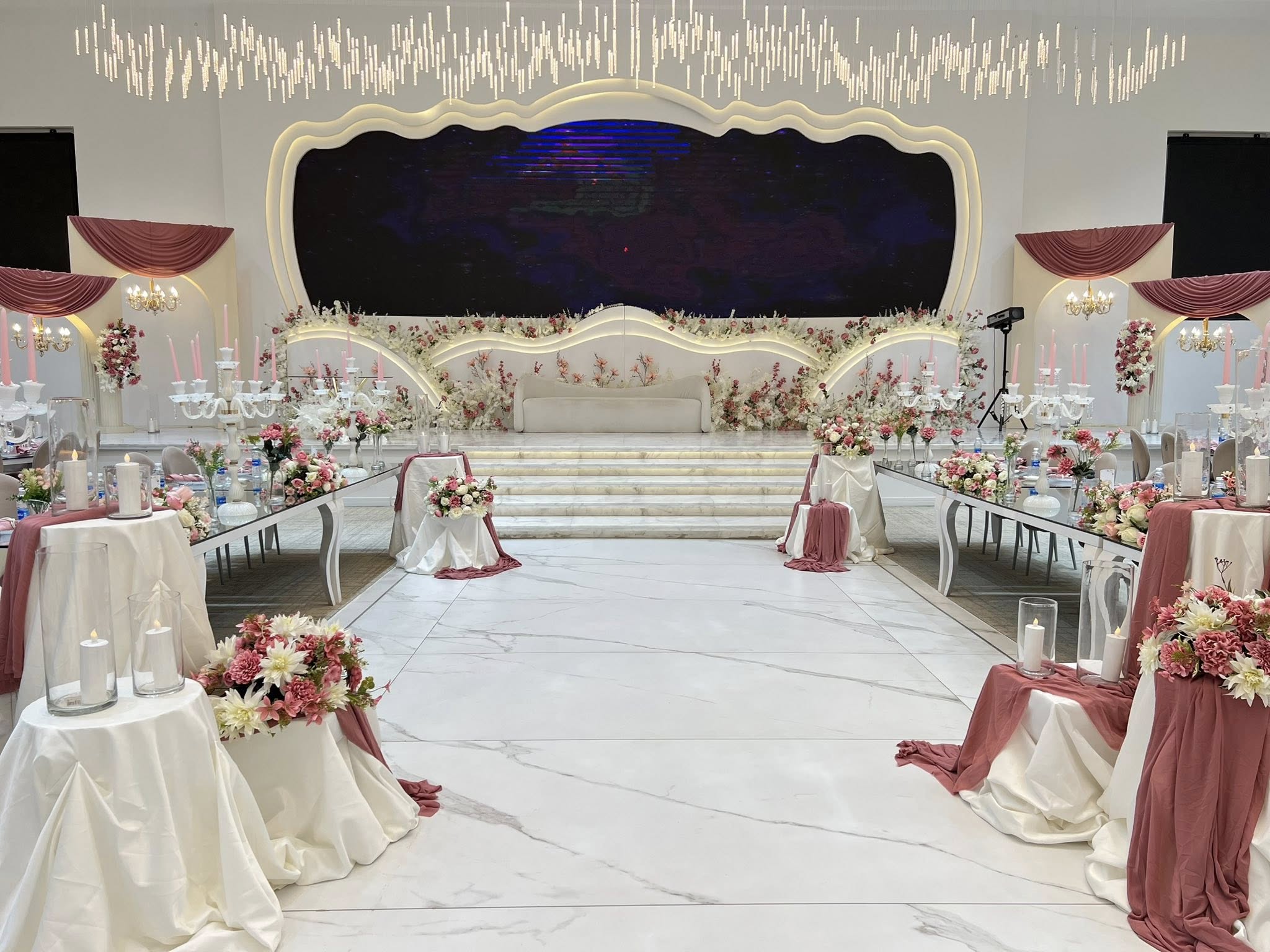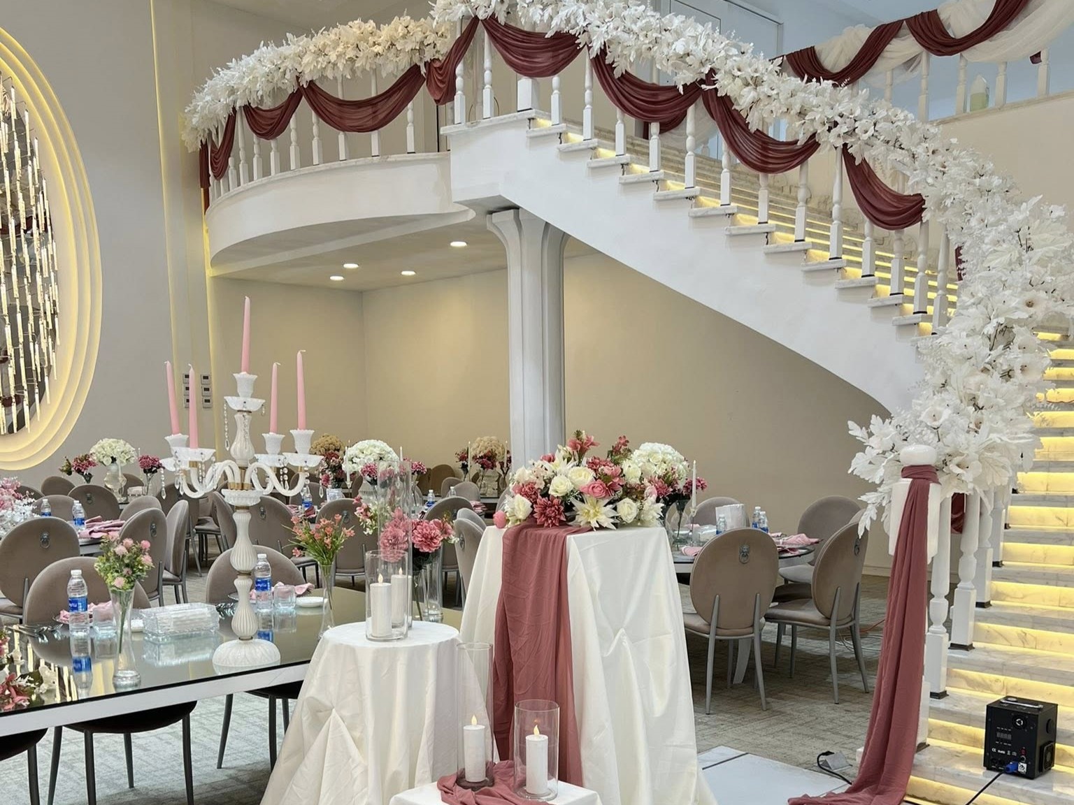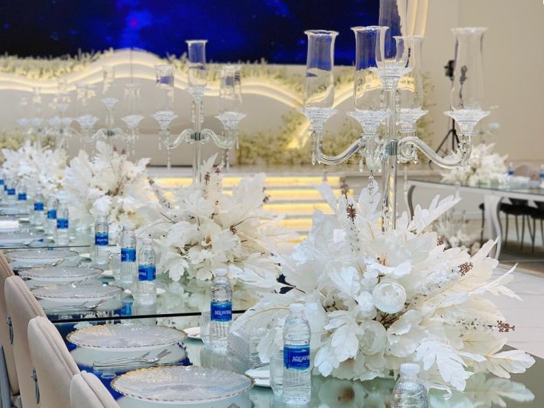 • خدمة التنسيق الشامل للحفل من البداية حتى النهاية، تشمل تنسيق الطاولات، الزهور، الإضاءة، ومدخل القاعة.