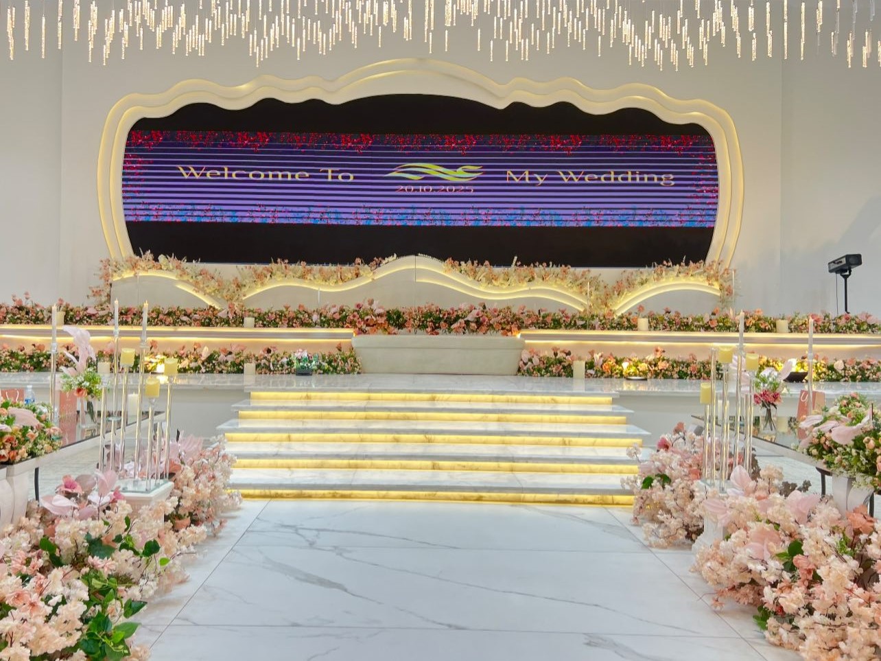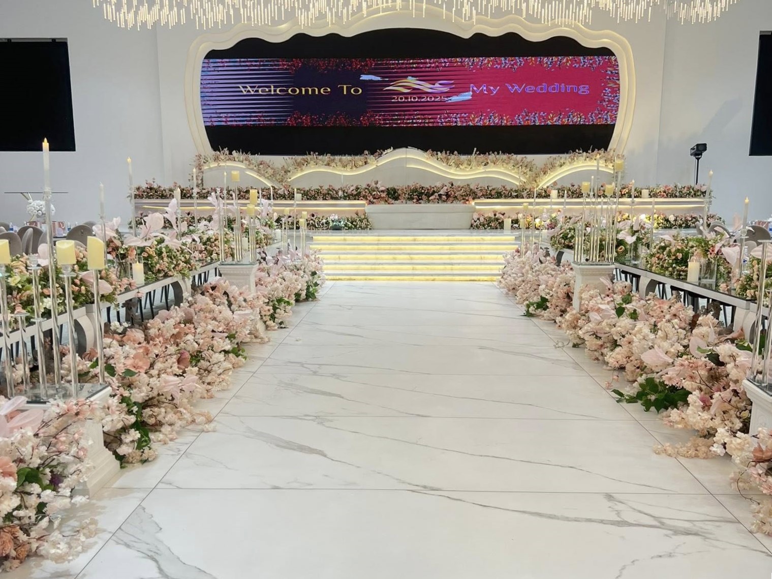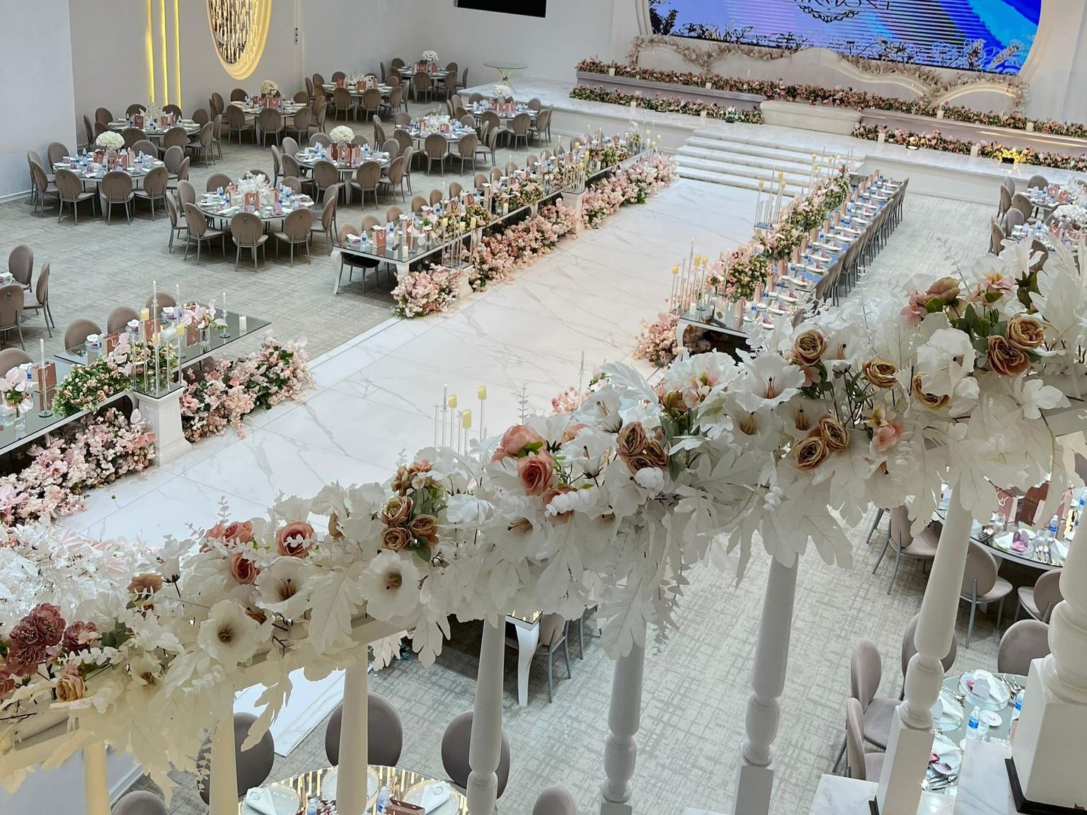 • خدمة التنسيق الشامل للحفل من البداية حتى النهاية، تشمل تنسيق الطاولات، الزهور، الإضاءة، ومدخل القاعة.
