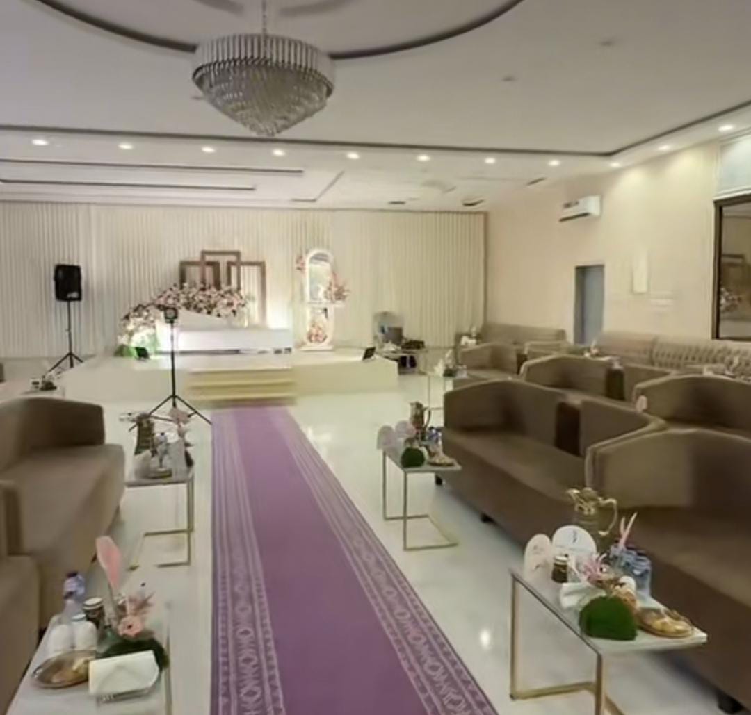 تم تجهيز القاعة بتصميم أنيق وعملي يناسب حفلات الزفاف الصغيرة والمتوسطة، إضافة إلى الخطوبات والملكات وأعياد الميلاد والاجتماعات العائلية. كما تم توزيع الطاولات والكراسي داخل القاعة بطريقة منظمة تتيح الاستفادة من المساحة وتمنح الضيوف أجواء مريحة طوال الحفل.