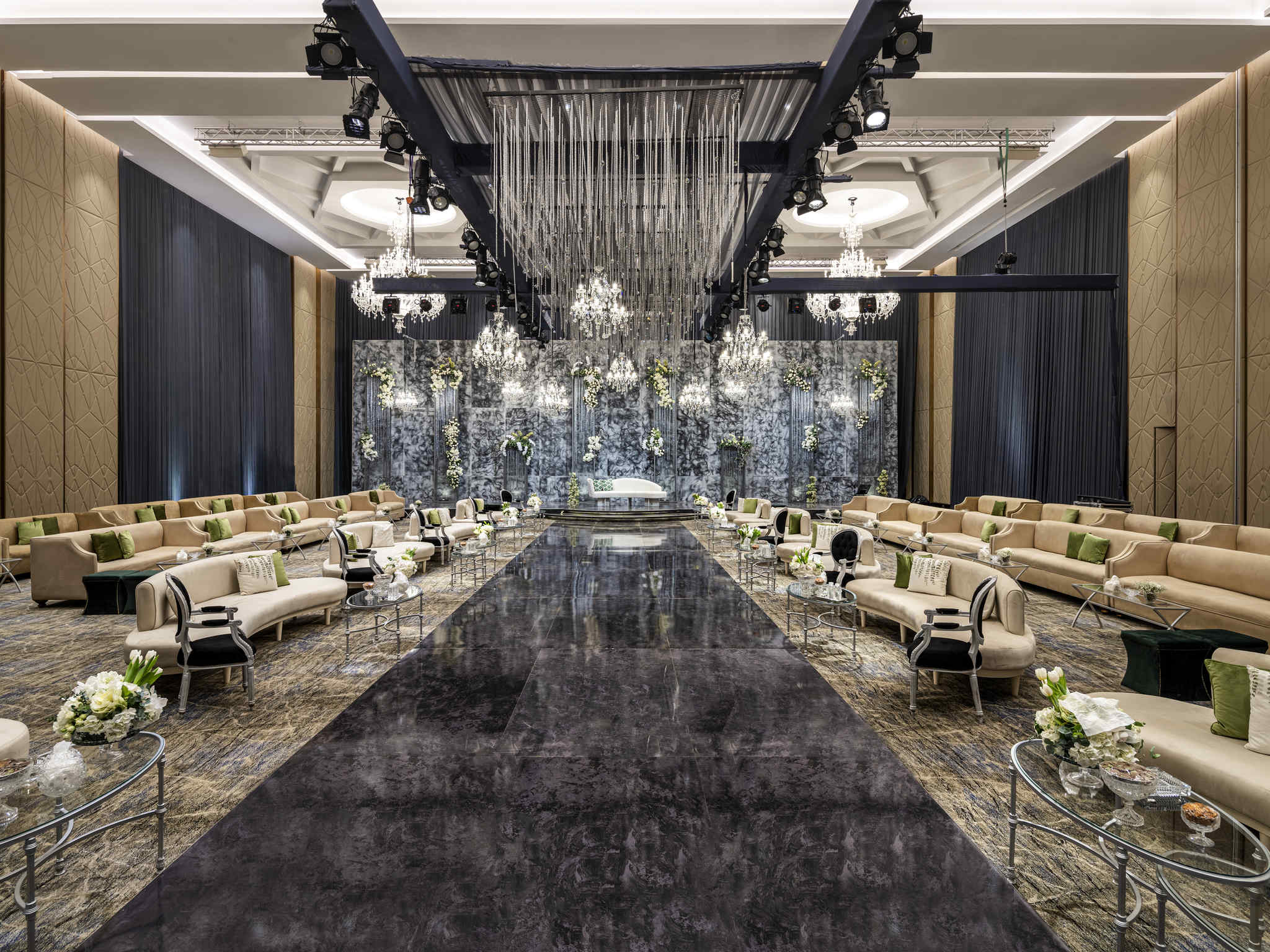 في فندق موفنبيك الرياض بتلقى القاعة الكبيرة اللي مصممة خصيصًا للأعراس الفاخرة والمناسبات الضخمة. القاعة تتميز بمساحة واسعة تستوعب من 200 إلى 400 ضيف، وتجي بديكورات راقية، سقوف عالية، ثريات فخمة وأجواء ملكية تخلي حفل الزفاف أو المناسبة يظل بالذاكرة.