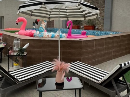 الشاليه مجهز بمساحتين خارجيتين مثالية للجلسات مع وجود حمام سباحة ورذاذ مائي يضيف أجواء منعشة.