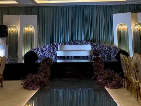 مسرح كبير للكوشة مع ممر مضيء للزفة.