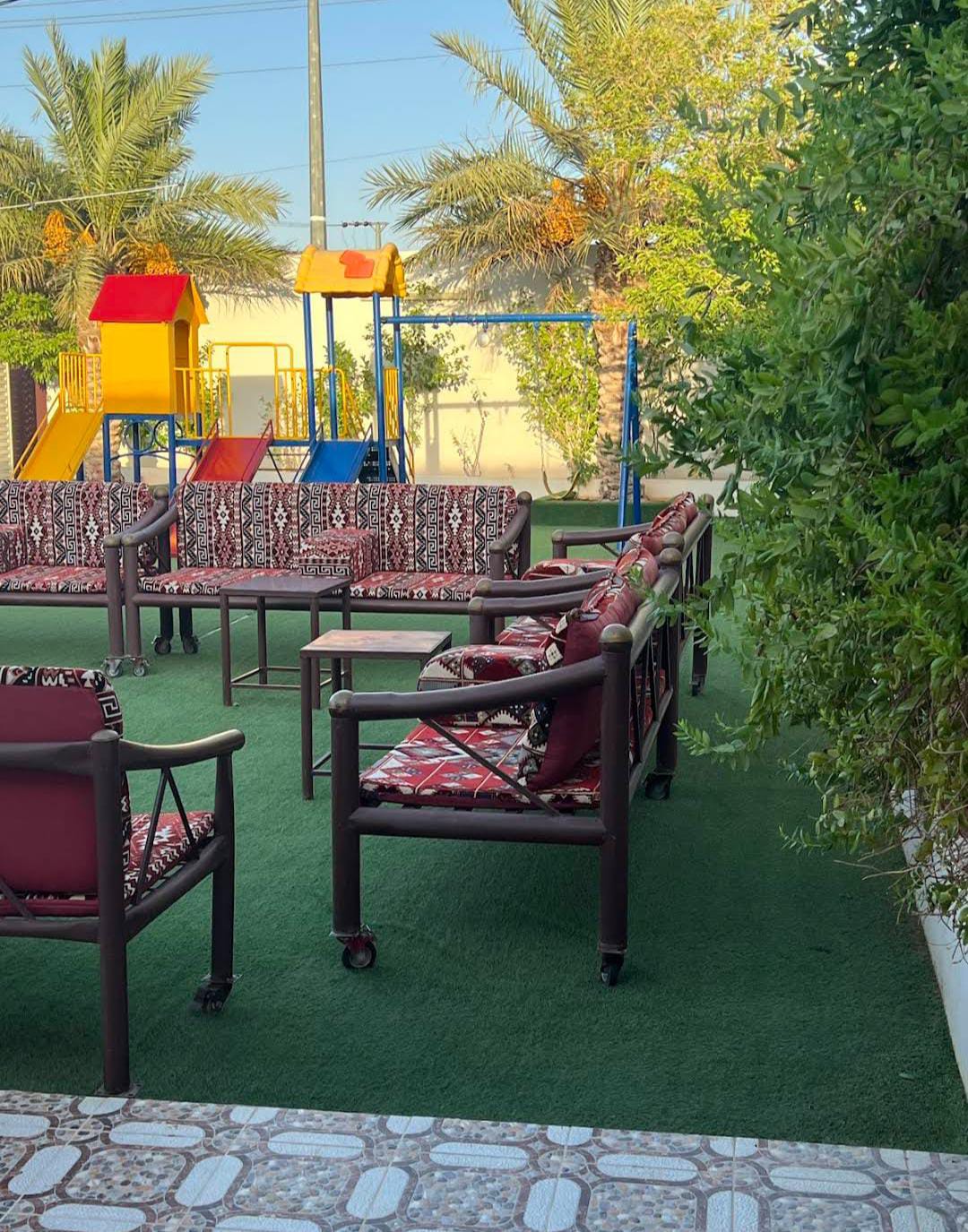 المنتجع يضم أيضاً جلسات خارجية واسعة ومزروعة تمنح المكان أجواء جميلة وهادئة، إضافة إلى قسم نسائي كبير يوفر الخصوصية للعائلات، إلى جانب منطقة ألعاب مخصصة للأطفال ليكون المكان مناسباً لجميع أفراد العائلة.