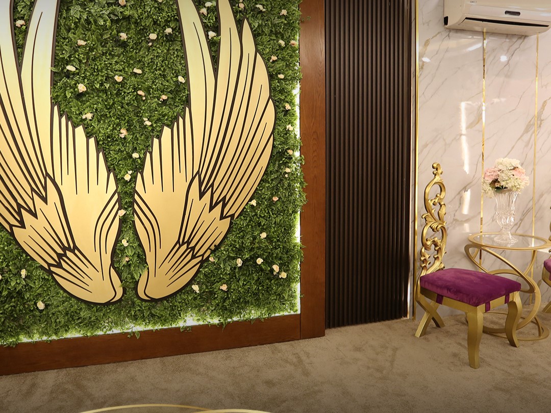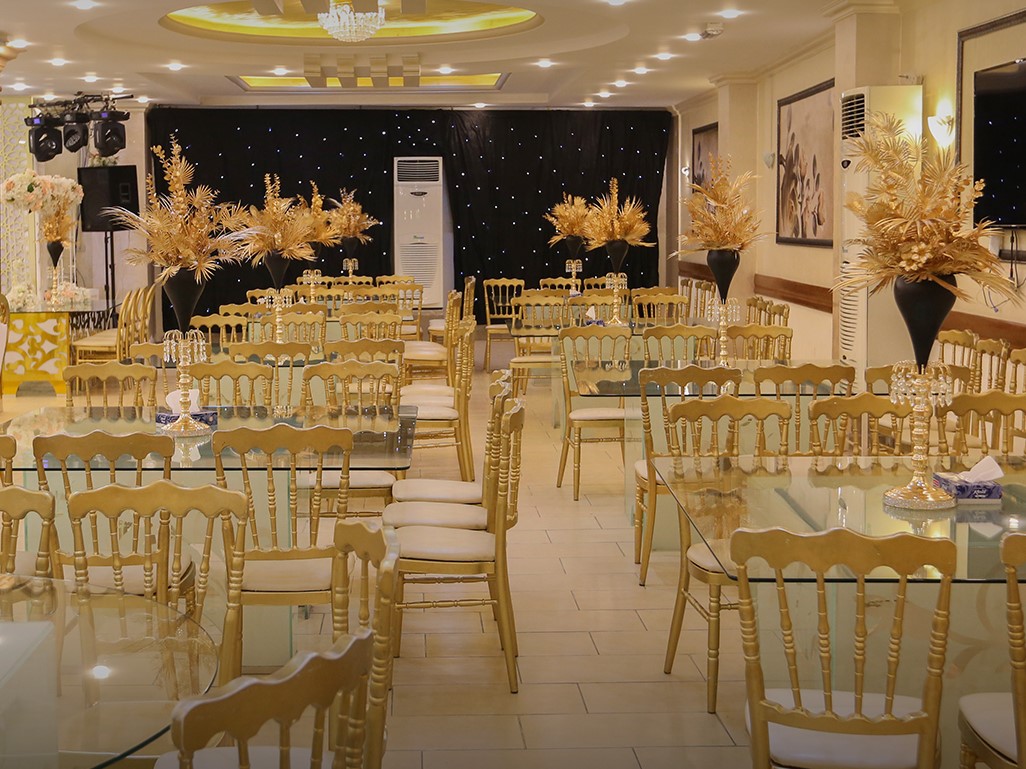 القاعة الذهبية تجمع بين الأناقة الكلاسيكية واللمسة العصرية لتكون خيارك الأمثل لحفل راقٍ وهادئ يتسع حتى 200 شخص.