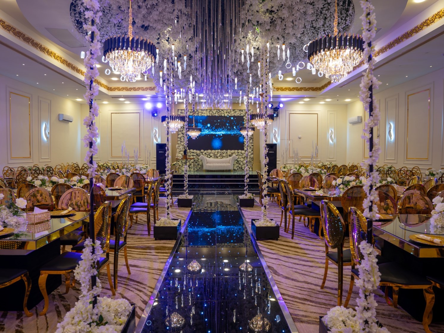 تحتضن القاعات أجواء من الفخامة مع تصاميم راقية وإطلالات ساحرة، وتتوفر فيها جميع الخدمات الأساسية والمتكاملة التي تليق بحفلات الزفاف، الخطوبة، التخرج، أو أي مناسبة خاصة ترغبون بتخليدها.