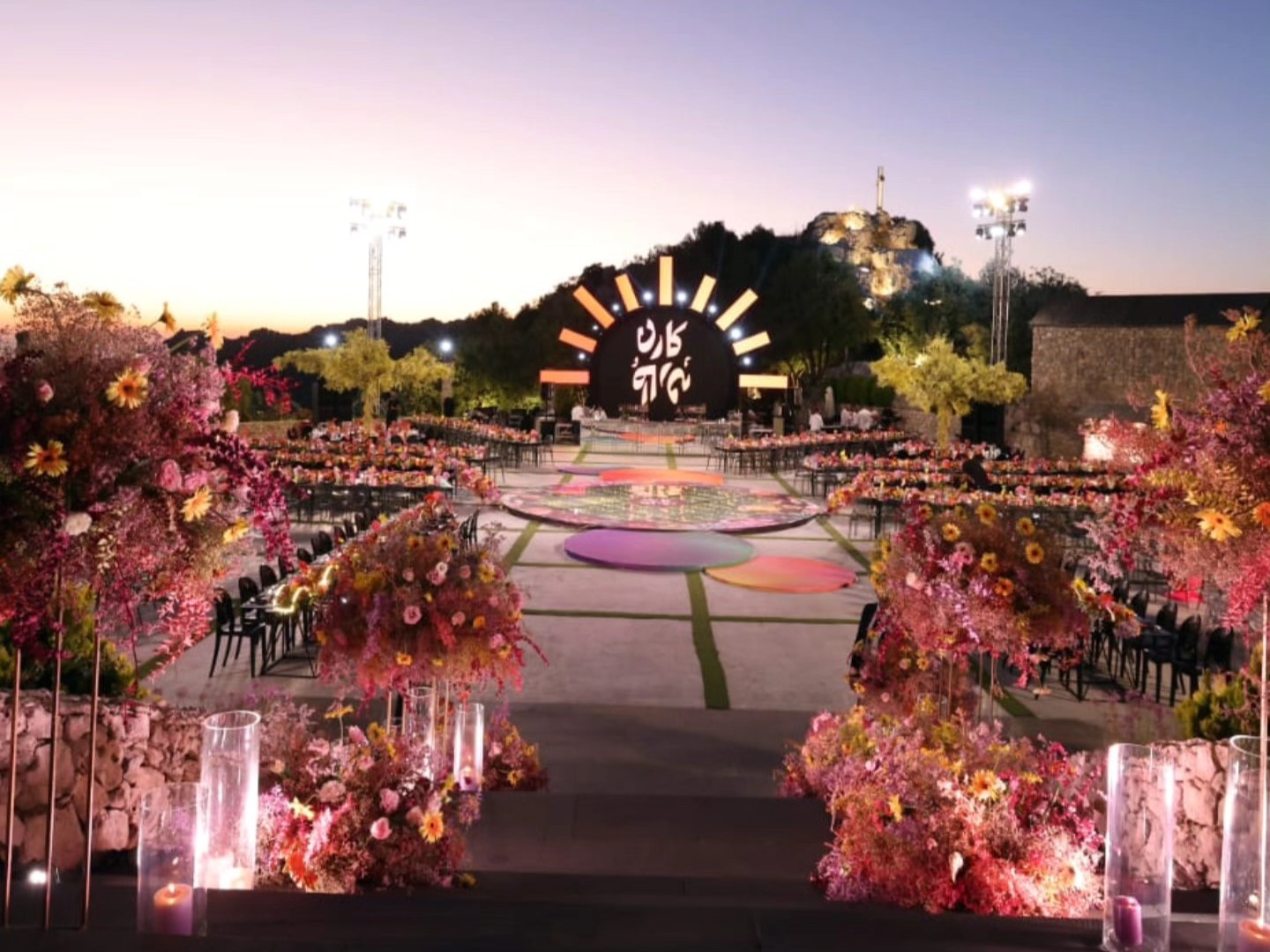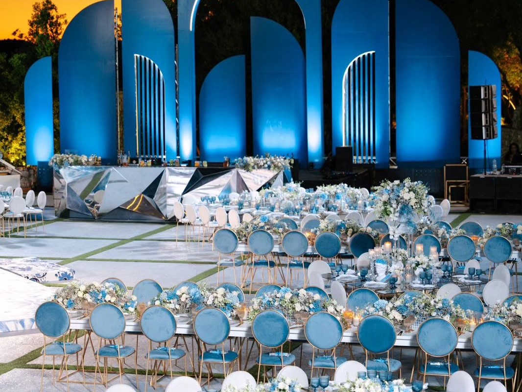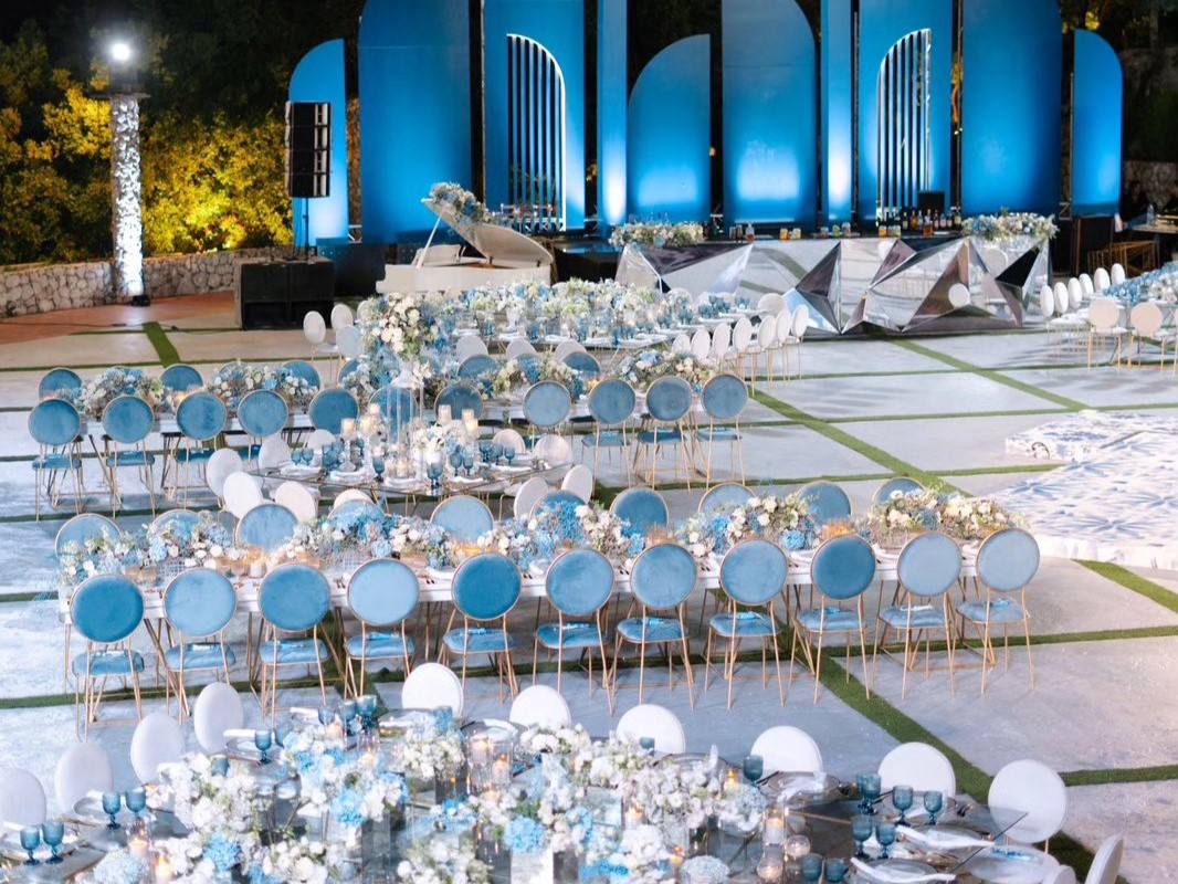 الطاولات والكراسي بتتزيّن بأرقى أنواع الأقمشة والزينة، مع توزيع مدروس بيضمن راحة الضيوف وسلاسة الحركة خلال الحفل، وكل عنصر بالمكان بيندمج مع الطبيعة المحيطة ليعطي صورة متكاملة وفخمة.