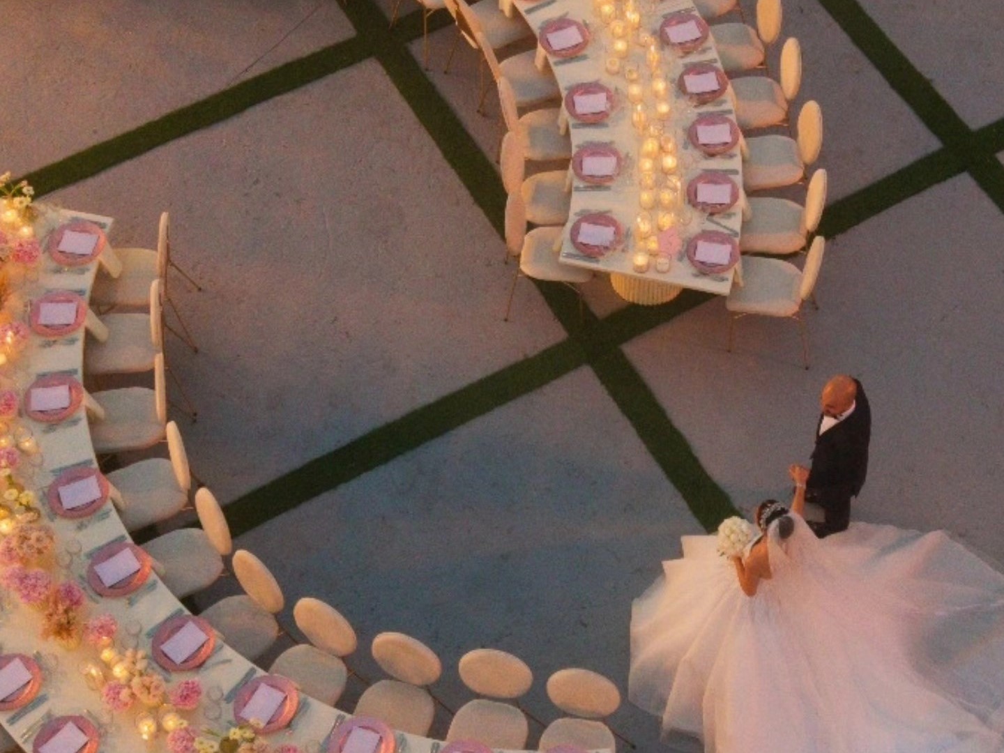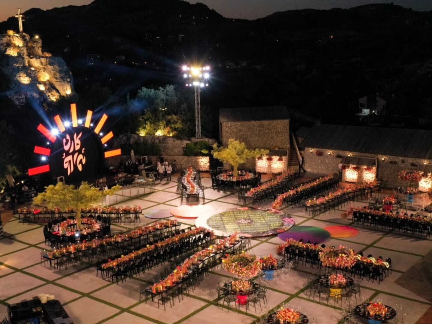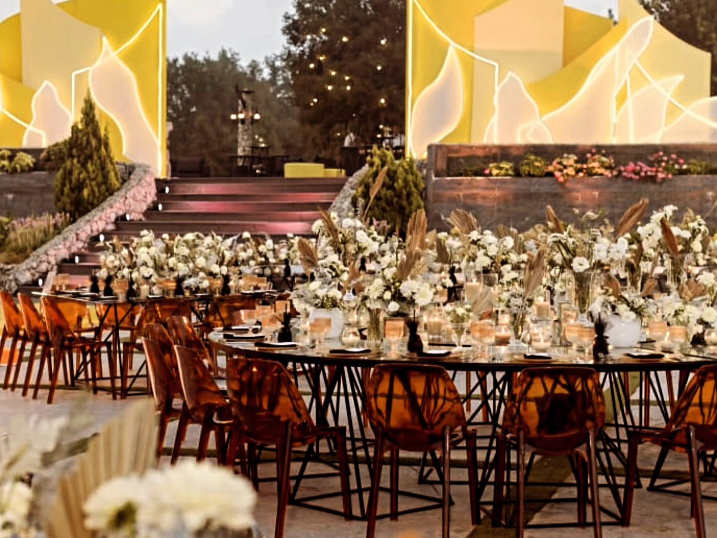 الطاولات والكراسي بتتزيّن بأرقى أنواع الأقمشة والزينة، مع توزيع مدروس بيضمن راحة الضيوف وسلاسة الحركة خلال الحفل، وكل عنصر بالمكان بيندمج مع الطبيعة المحيطة ليعطي صورة متكاملة وفخمة.