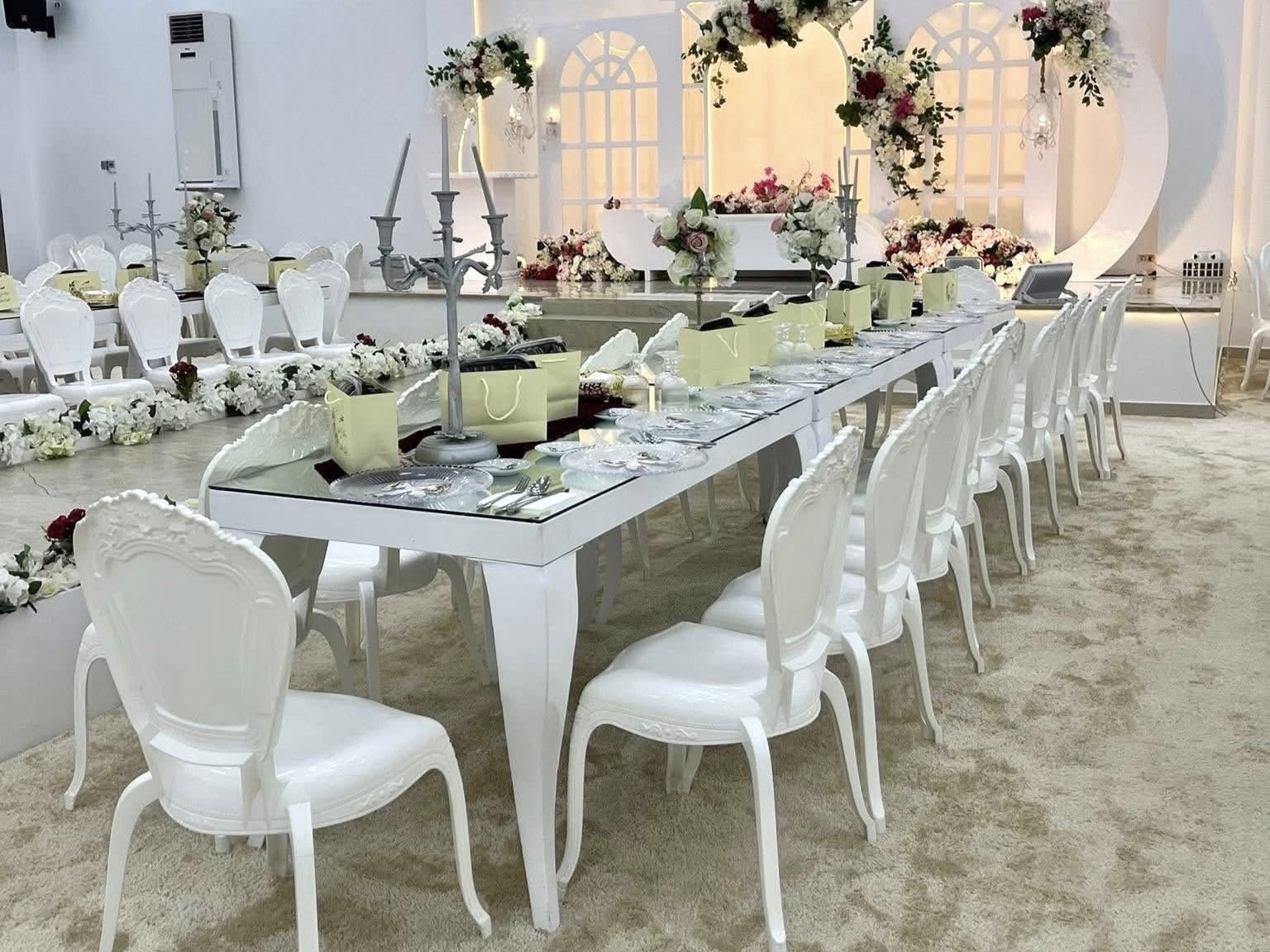 طاولات وكراسي فخمة بتنسيق متكامل مع ألوان القاعة.