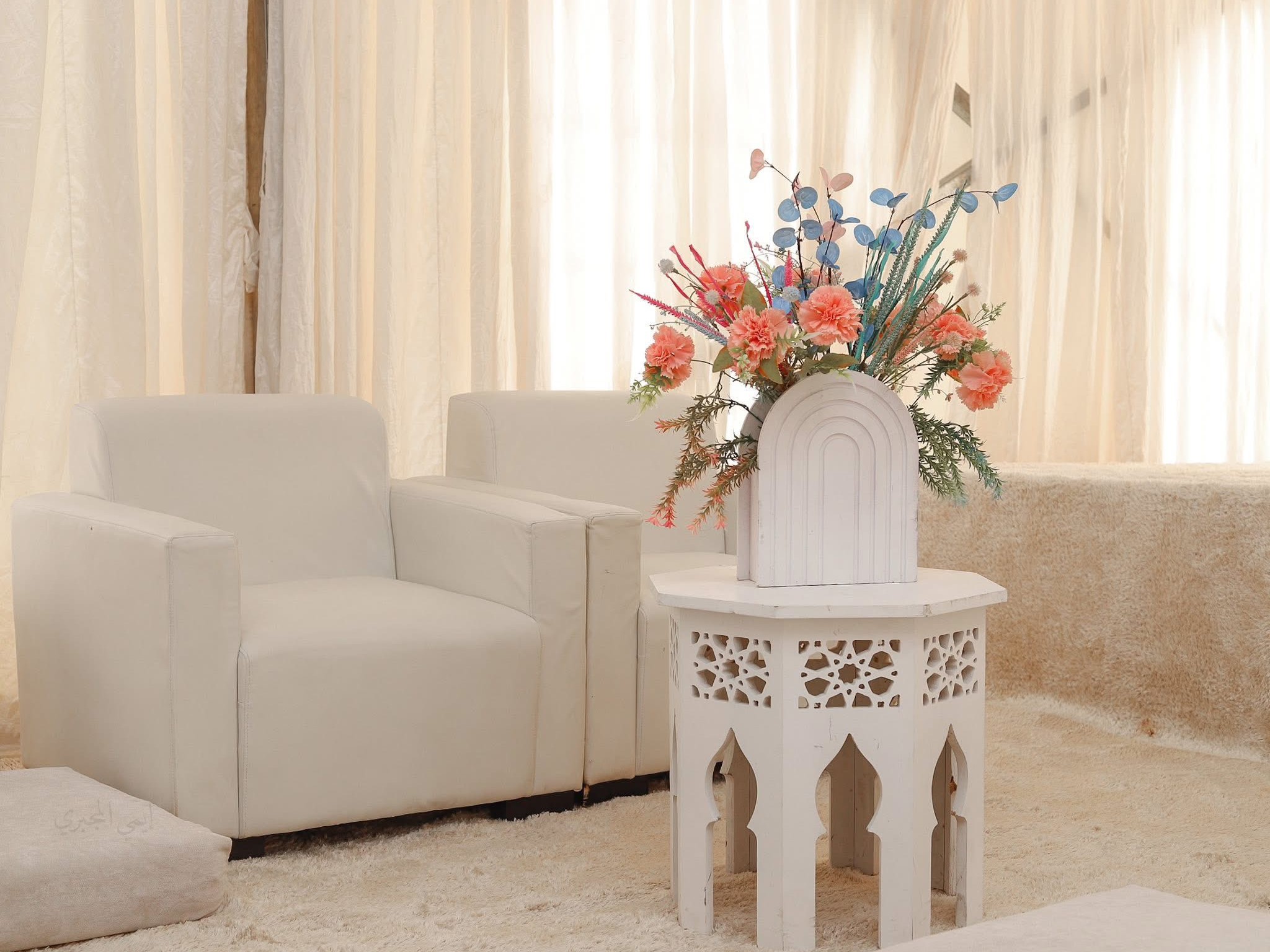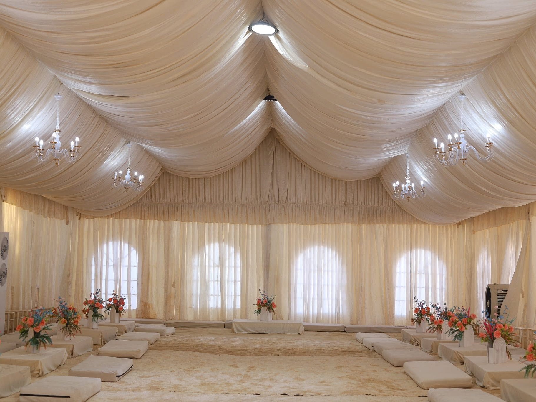 تنسيق كامل للقاعة يشمل الديكور، الإضاءة، وتنظيم الطاولات حسب نوع المناسبة.