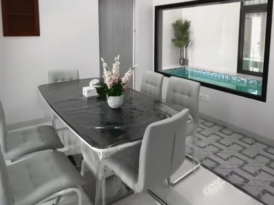صالة فسيحة تضم مطبخًا تحضيريًا وصالة طعام.