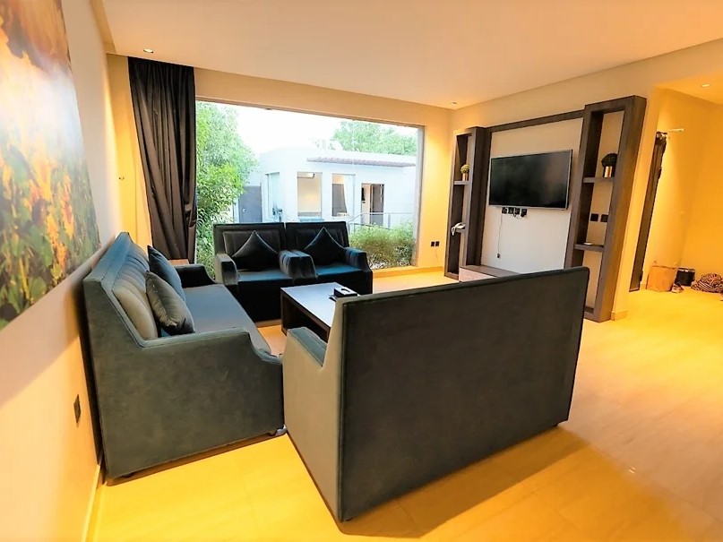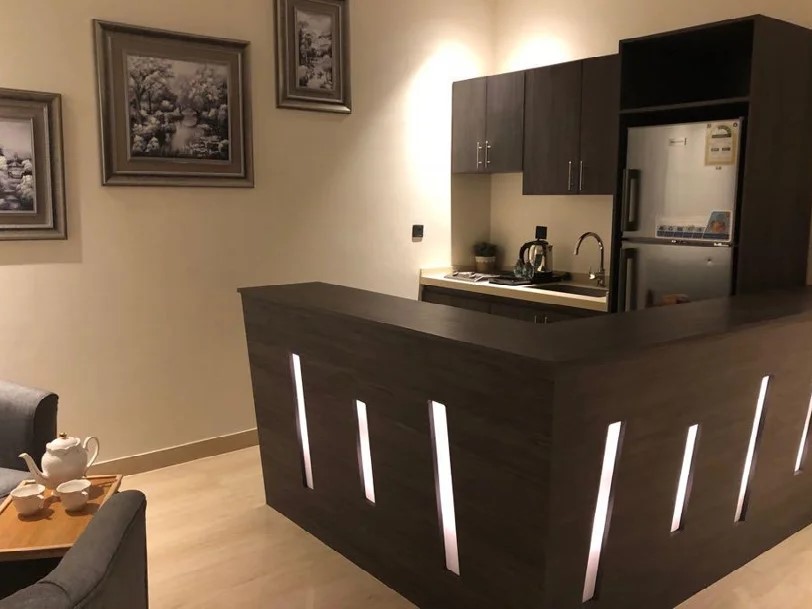 مع صالة أنيقة ومطبخ أمريكي مجهز بالكامل.
