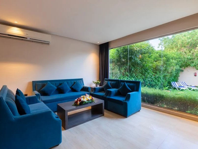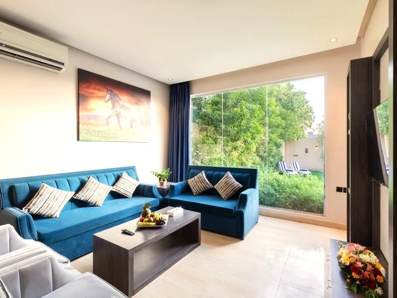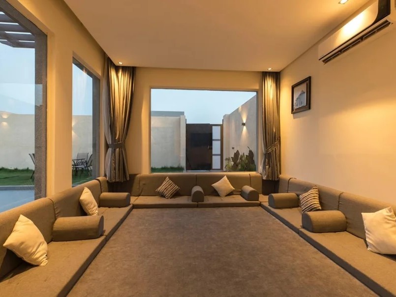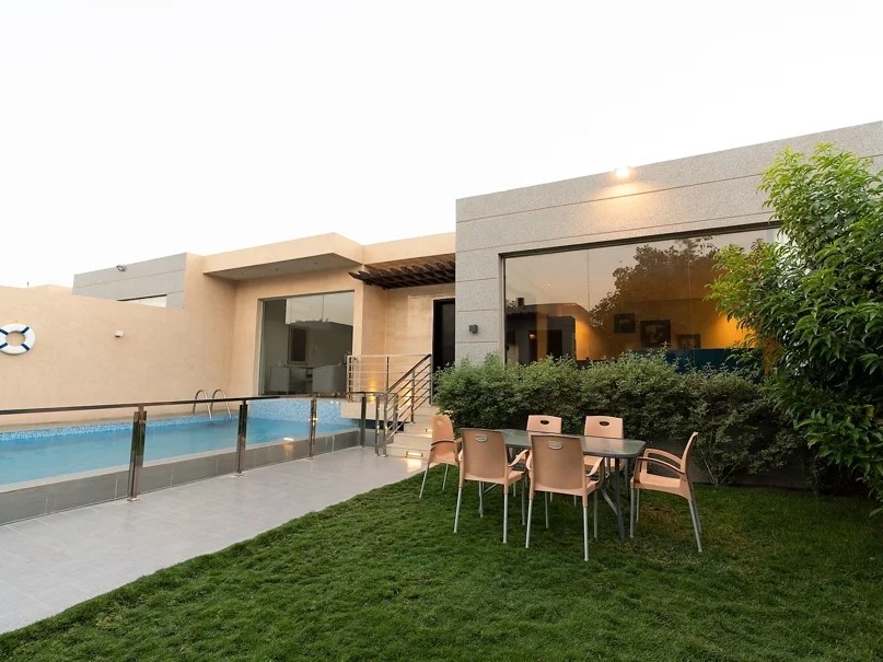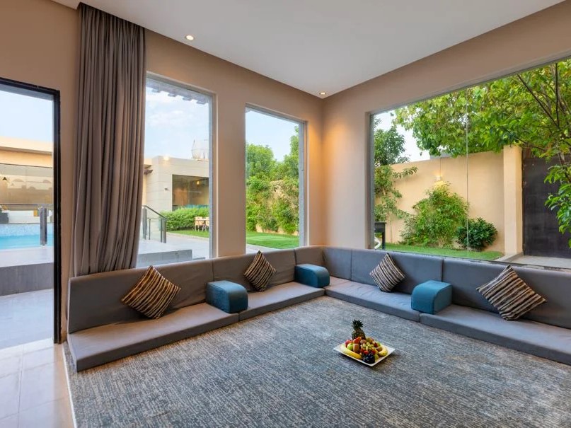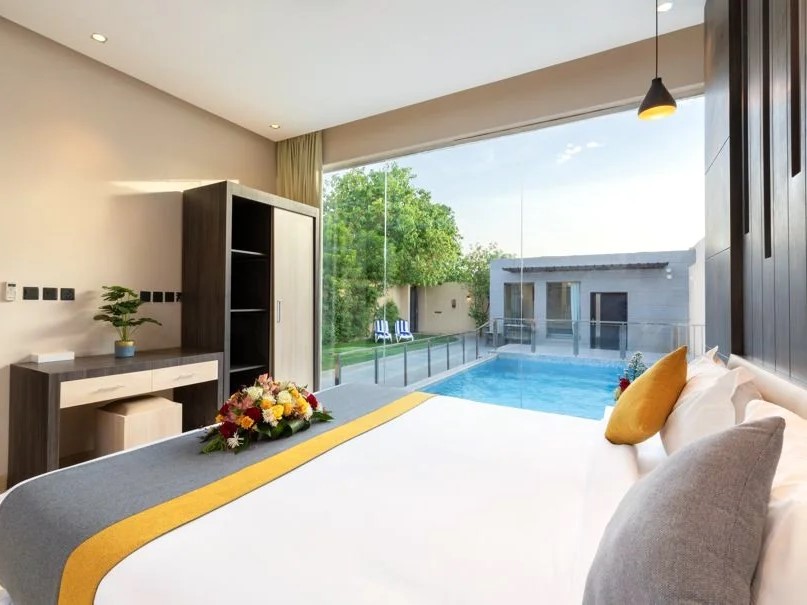 وجلسة عربية في ملحق مستقل مع دورة مياه خاصة ومطبخ صغير مطل على المسبح.