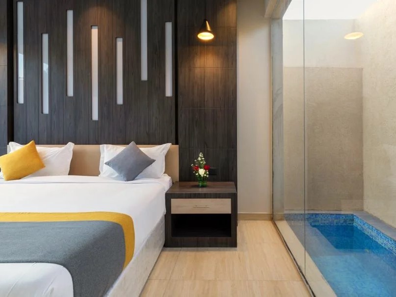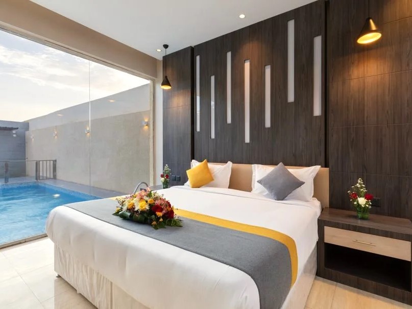 غرفة نوم مطلة على المسبح والمسطحات الخضراء،