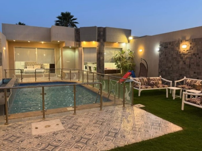 شاليه بمساحة 350 متر، يوفر لكم مسبح خاص، جلسات أنيقة داخلية وخارجية، مطبخ مجهز بالكامل،