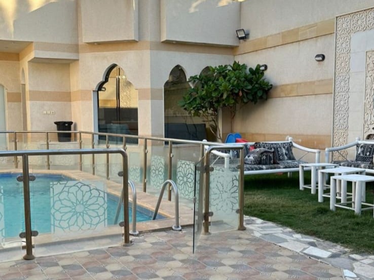شاليه فخم بمساحة 350 متر، مجهز بمسبح خاص ومساحات جلوس واسعة.