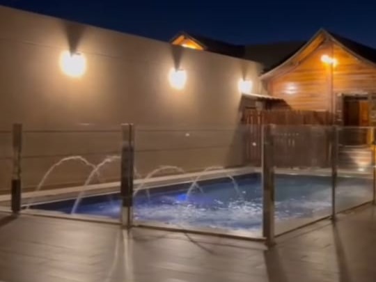 شاليه جميل فيه غرفة بسرير مريح، حمام مجهز، ومسبح خاص داخل الشاليه. المكان يوفر لك خصوصية تامة وخدمات راقية تخلّي تجربتك مختلفة.