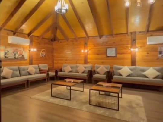 شاليه أنيق يحتوي على غرفة واسعة بسرير مريح، حمام فاخر، ومسبح داخلي خاص. يتميز بديكور عصري مع مساحات رحبة تناسب العائلات.