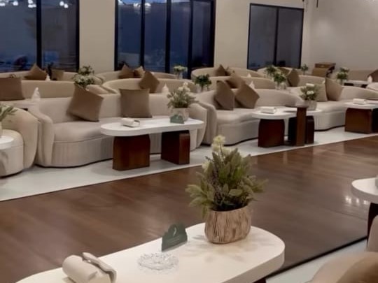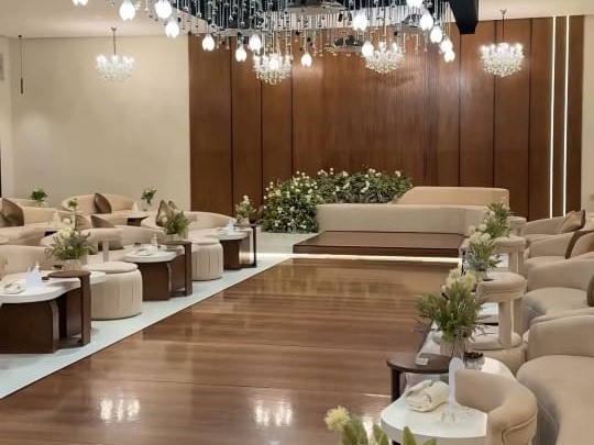 القاعة فيها كوشة أنيقة وطاولة عطور فاخرة، وصالة طعام تكفي 110 شخص عشان الضيوف يتمتعون بالأكل براحتهم. وفي الدور الثاني غرفة كبيرة خاصة للعروسة مع غرفة للعبايات وجلسة خارجية