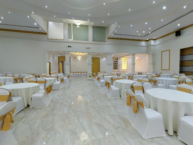 تضم القاعة قاعات واسعة لمختلف أنواع المناسبات، وتتسع قاعة النساء لـ 400 شخص، بينما تتسع قاعة الرجال لـ 320 شخص، كما يوجد صالة للطعام بسعة 400 شخص.