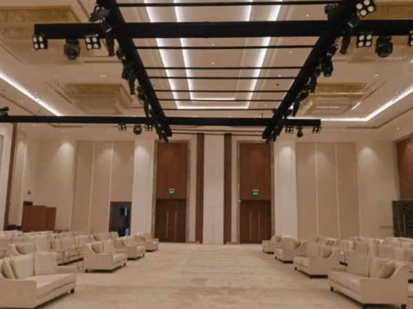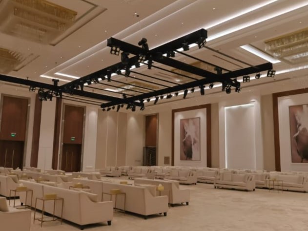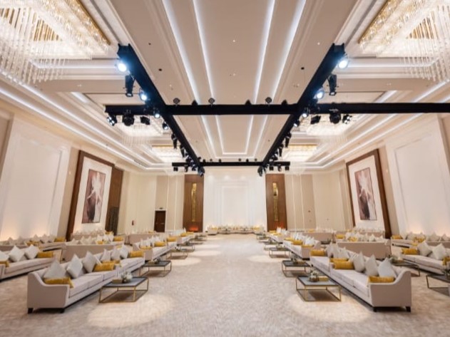 تصميم القاعة يجمع بين الألوان الناعمة والديكورات الفخمة، مع إضاءات ساحرة وممر عروس يليق بيومك المميز.