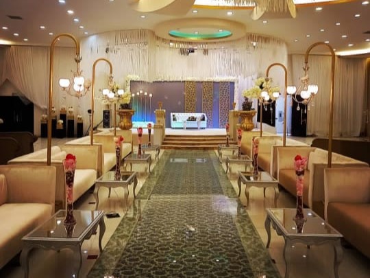 الديكورات عندنا تجنن! أسقف وجدران مزينة، أرضية رخامية، طاولات وكراسي فخمة، وممر زفة رخامي يلمع. الكوشة بتاعتنا في مسرح كبير، والإنارة كريستال وملونة تخلي المكان سحري!