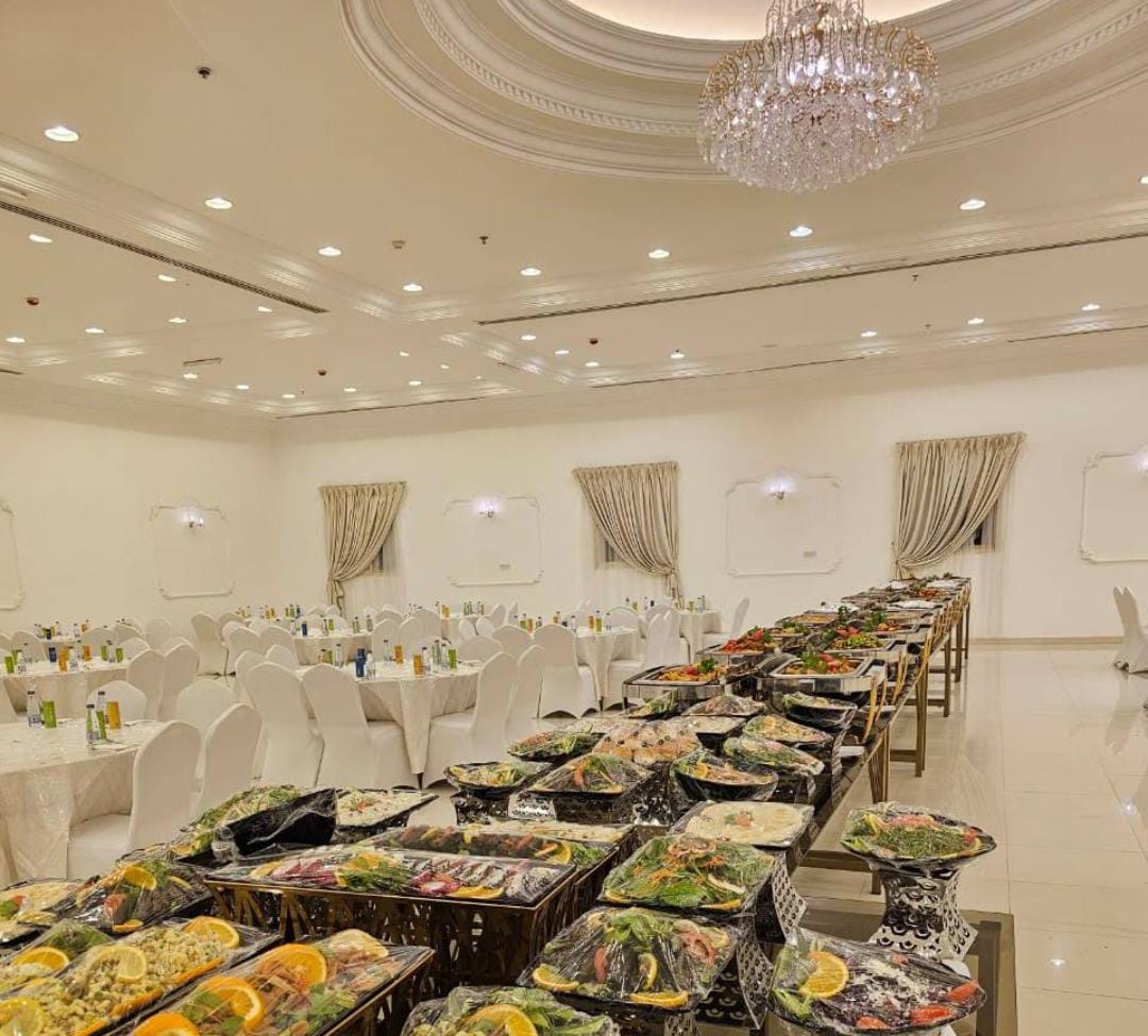تقدم القاعة خدمة البوفيه المفتوح الذي يشمل مجموعة متنوعة من الأطباق الشرقية والغربية والمقبلات والحلويات، إضافة إلى تقديم المشروبات الساخنة والباردة طوال الحفل. كما توفر القاعة كيك الزفاف وخدمة طهي وتقديم الذبائح، مع إمكانية استقبال شركات بوفيه خارجية حسب رغبة العميل.