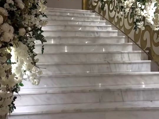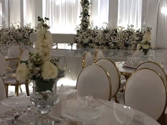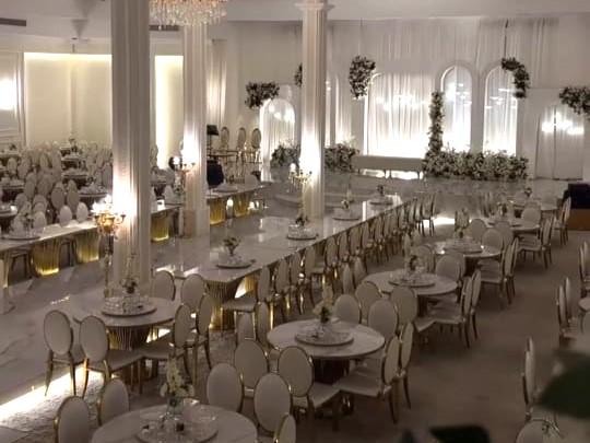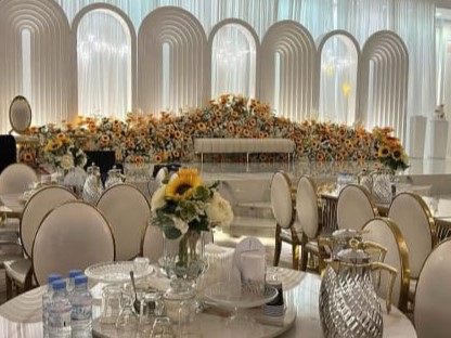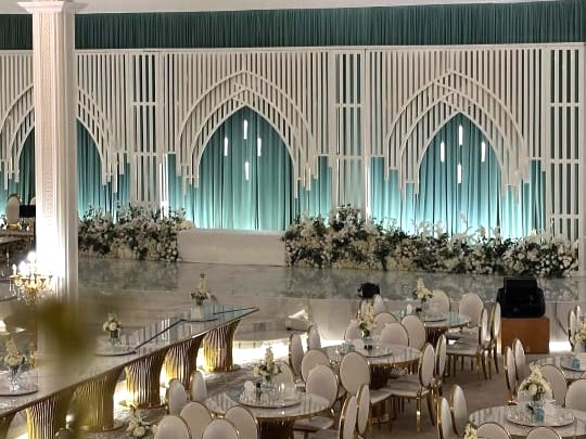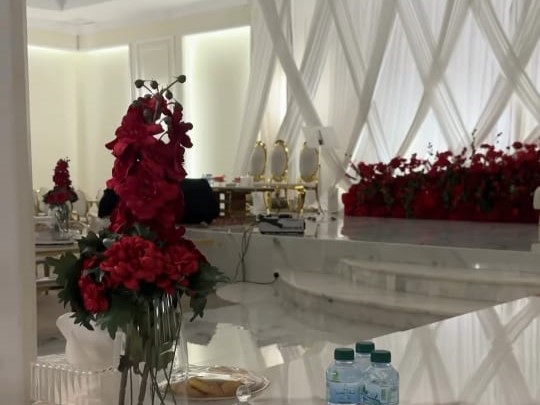 قاعة السيدات: 500 سيدة مع درج زفة مزين بالورود والشموع وممر رخامي زجاجي يوصل لمسرح الكوشة.