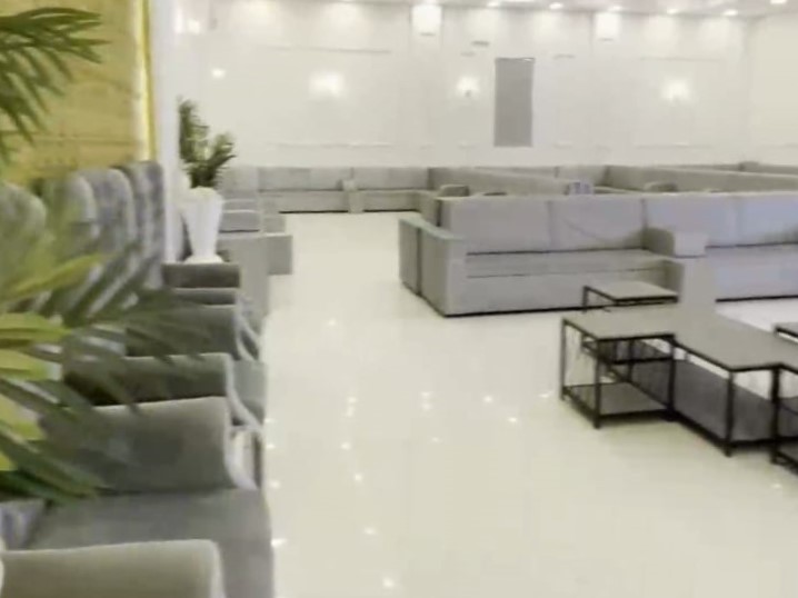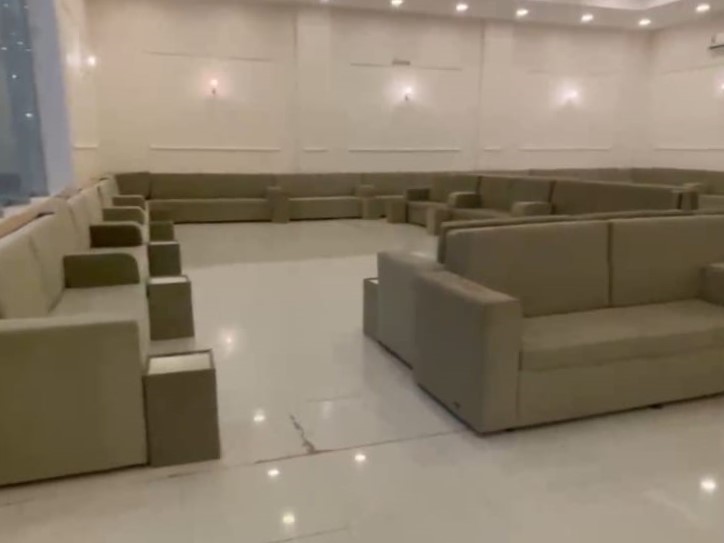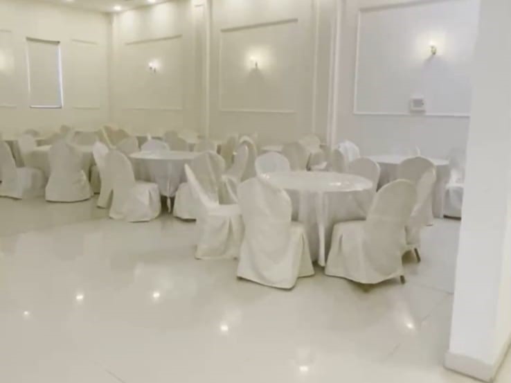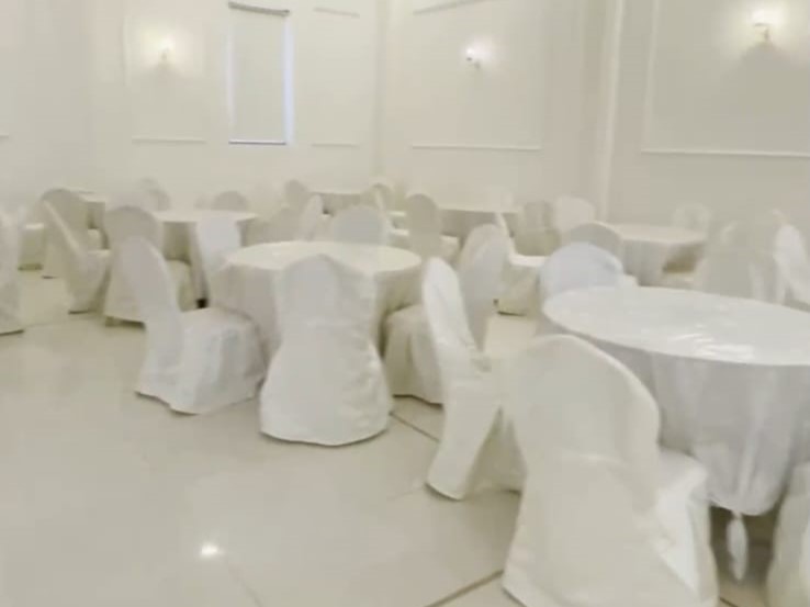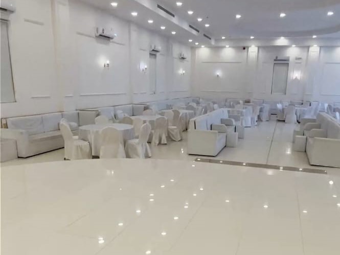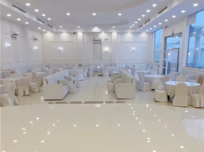 صالة طعام كبيرة مهيأة لاستقبال مئات الضيوف.