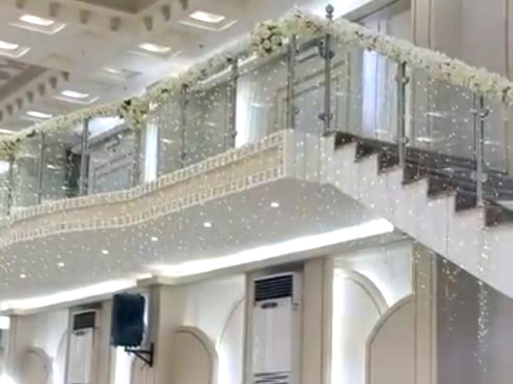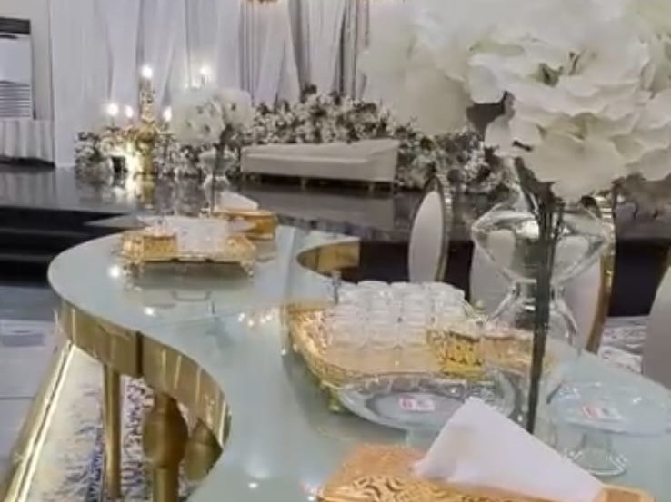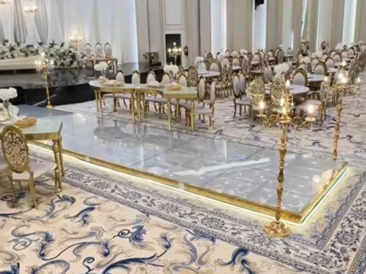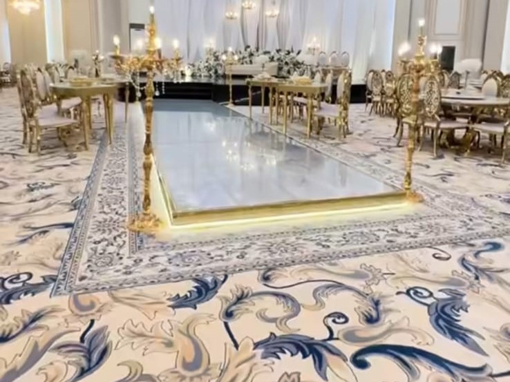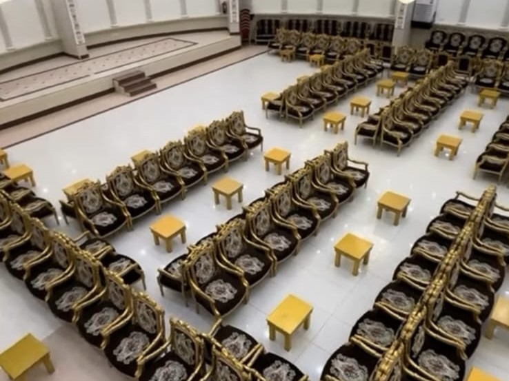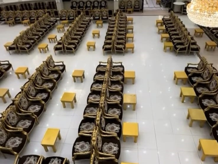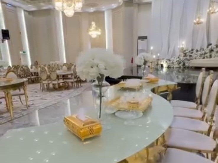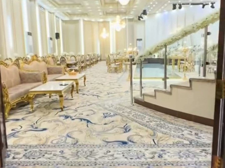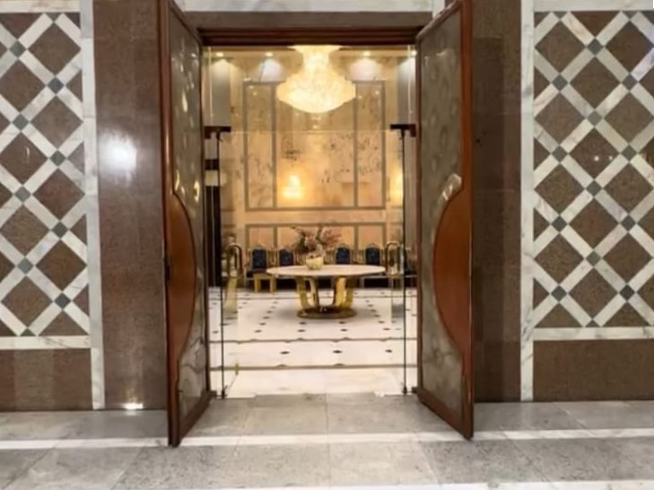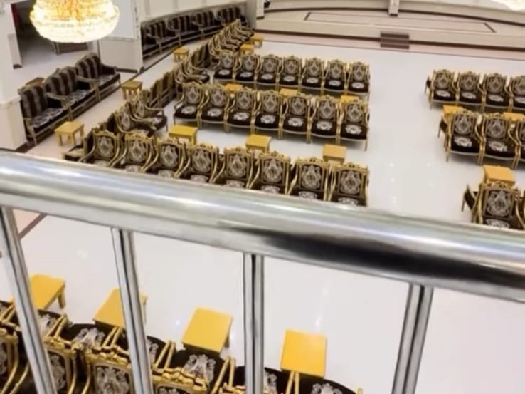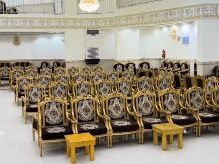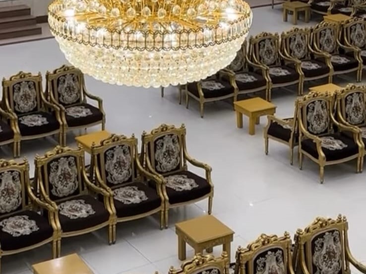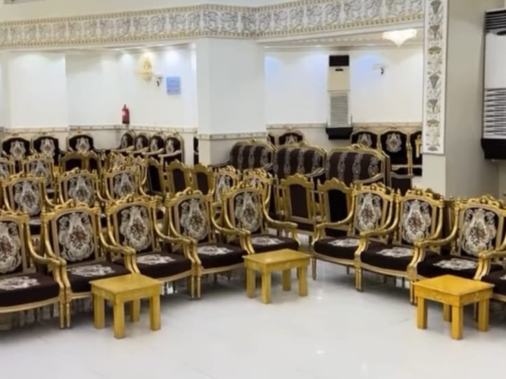 ديكورات فخمة وألوان راقية، كراسي مذهبة، أرضيات رخامية، وثريات كريستال تلمع وتعكس فخامة المكان.