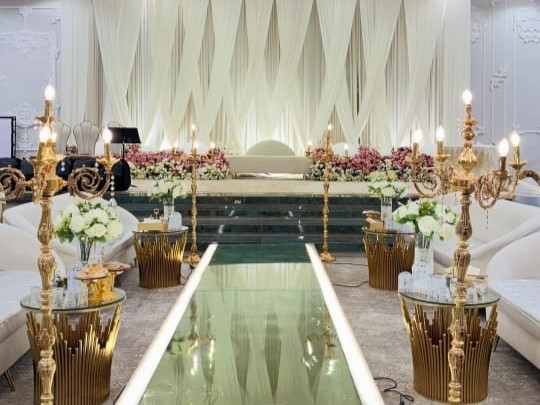 قاعة السيدات: 400 – 600 سيدة، بدون أعمدة، ممر زجاجي فاخر للزفة، ودرج أنيق يضيف لمسة فخامة.