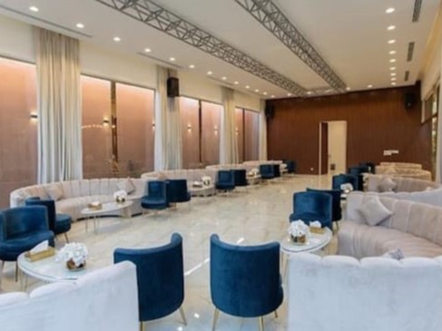 القاعة بتصميم أنيق ومساحات واسعة تستقبل حتى 100 ضيف في كل قسم (رجال ونساء).