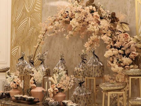 خدمة تقديم كيك الزفاف وحلويات فاخرة.