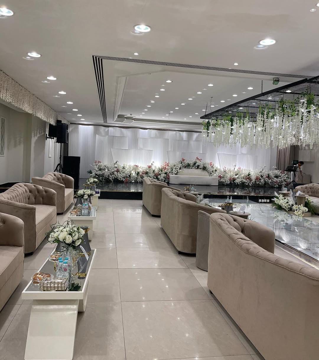 تتميز القاعات بتصميم عصري أنيق بدون أعمدة، مع أسقف عالية وأرضيات لامعة تعكس فخامة المكان. ويحتوي قسم النساء على ممر زفة رخامي متصل بمسرح واسع وكوشة مصممة بعناية، مع توزيع فاخر للأثاث من كنب وطاولات وكراسي بأقمشة عالية الجودة وديكورات راقية تضيف لمسة مميزة على أجواء الحفل.