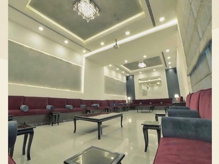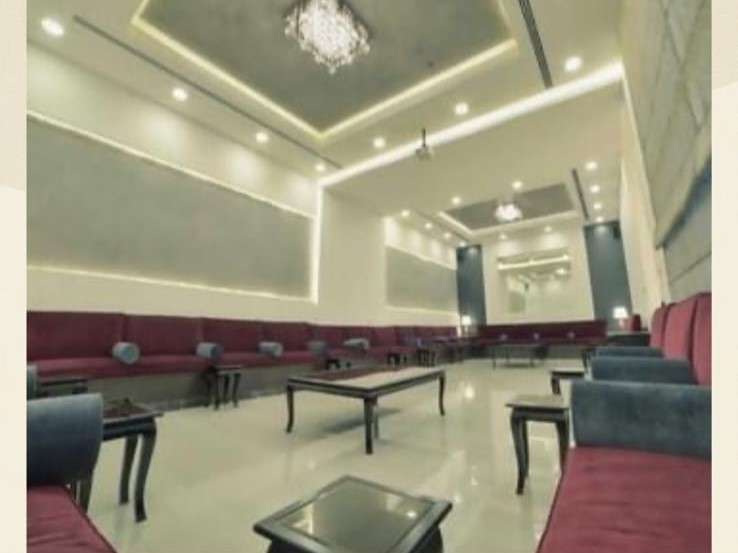 القاعة : قسم رجال وقسم نساء، كل قسم يسع لـ 60 ضيف، وصالة طعام لكل قسم تسع 50 شخص.