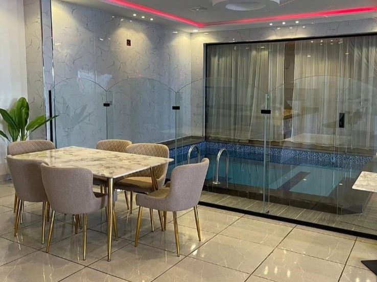 المنتجع يتميز بـ مسبح داخلي خاص يضمن لك خصوصية تامة وجو مريح طول اليوم .