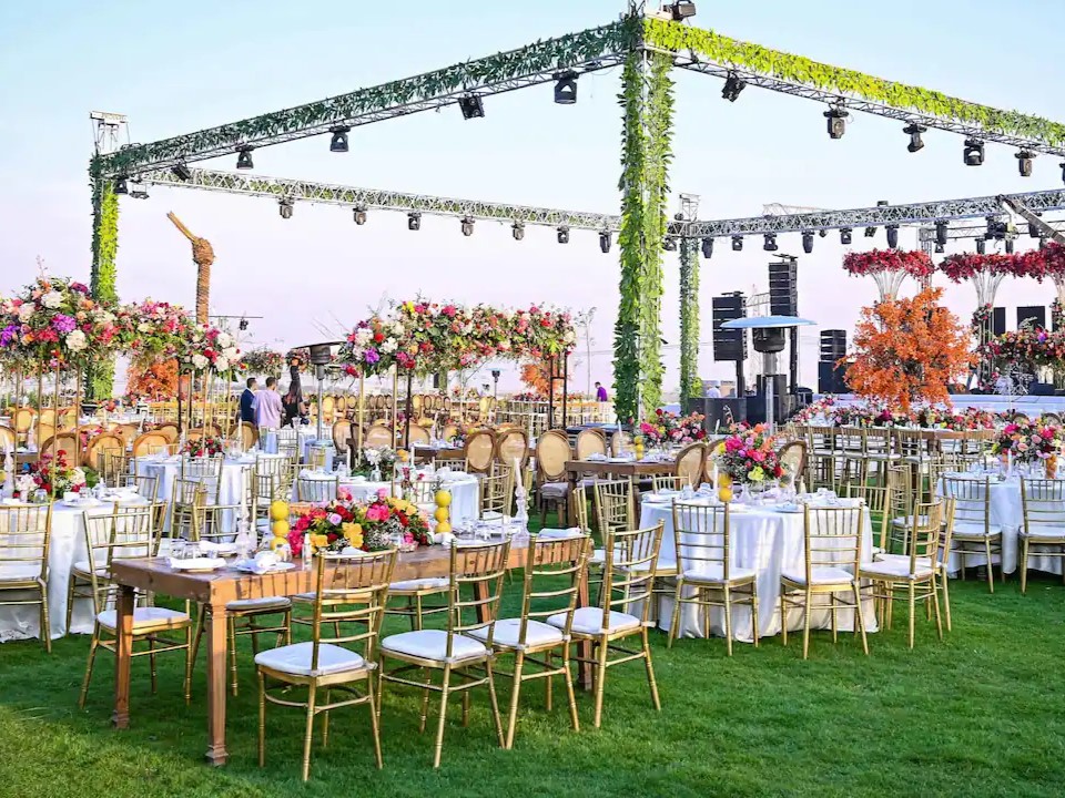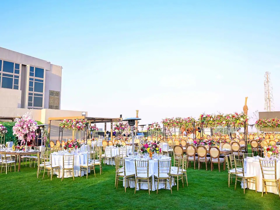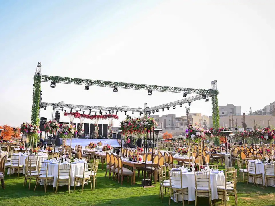 القاعة مثالية لحفلات الزفاف الفاخرة وسط الهواء الطلق والإطلالات المميزة.