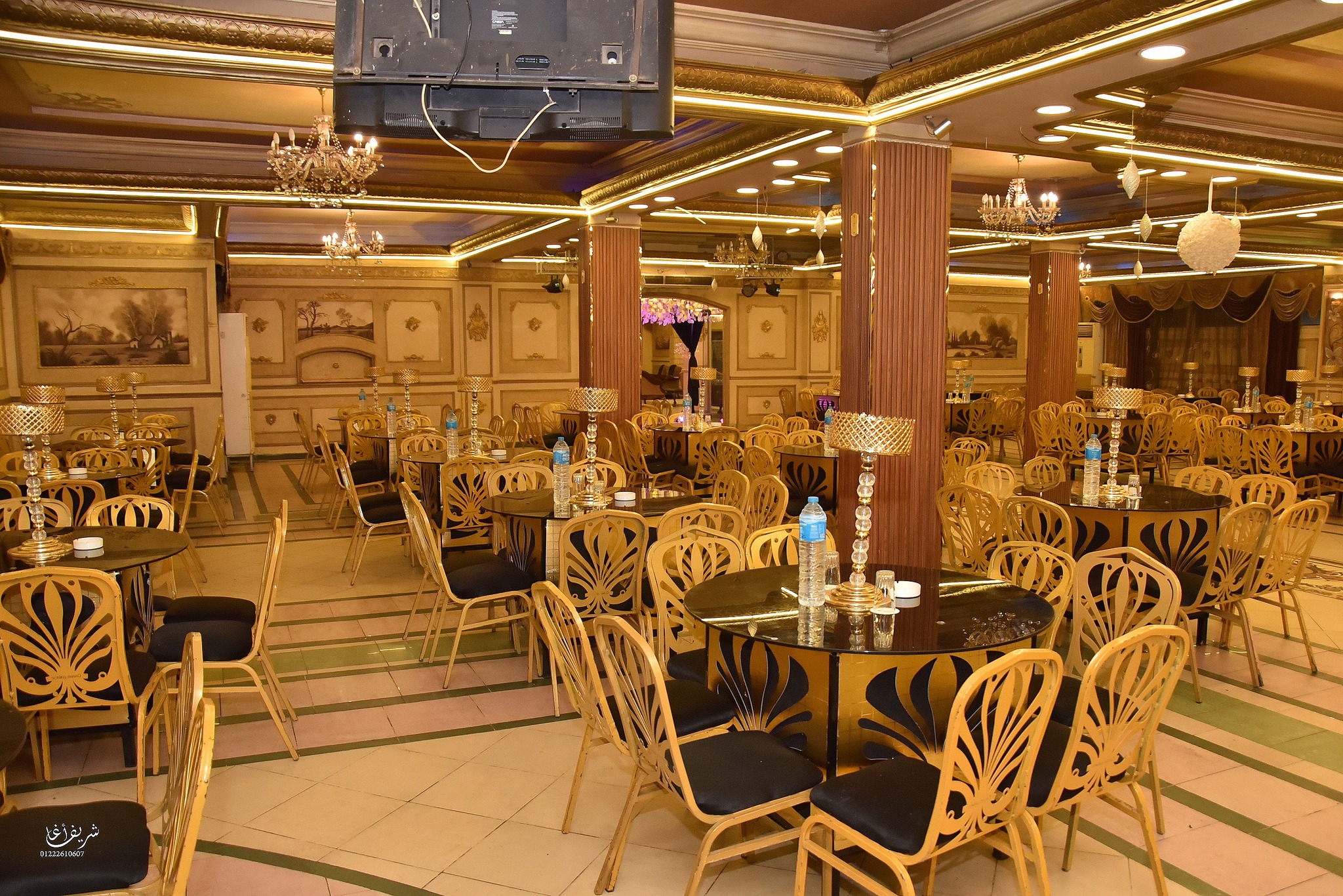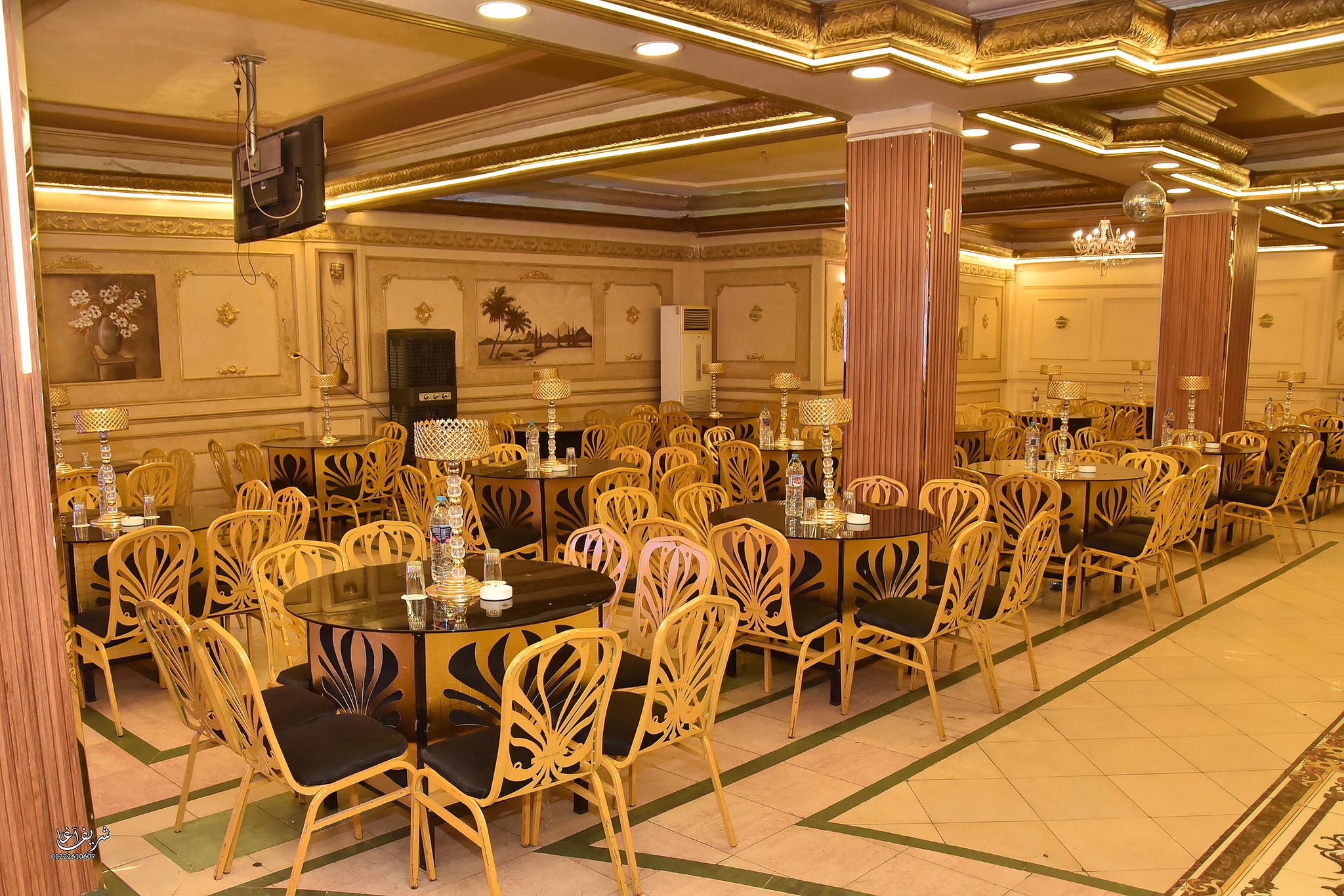 القاعة متصممة بأحدث الديكورات المودرن مع إضاءة مميزة بتدي شكل مختلف للصور والحفل.