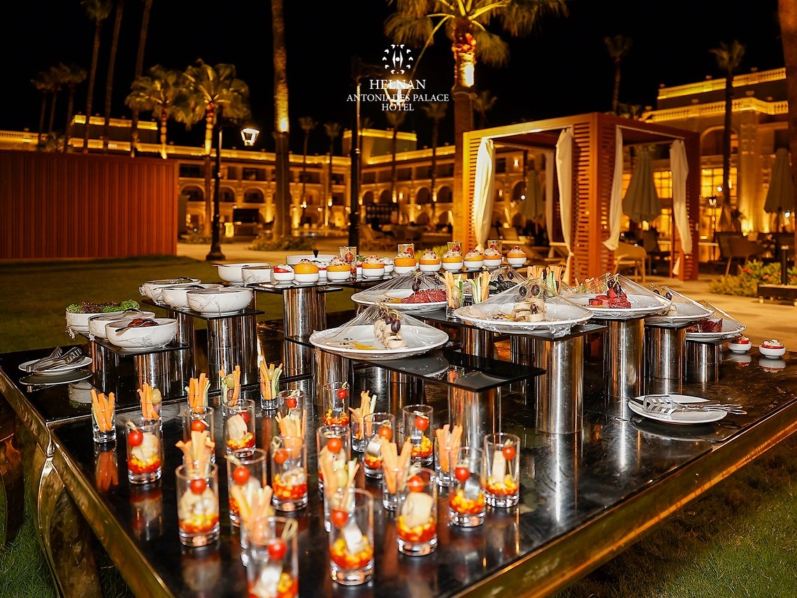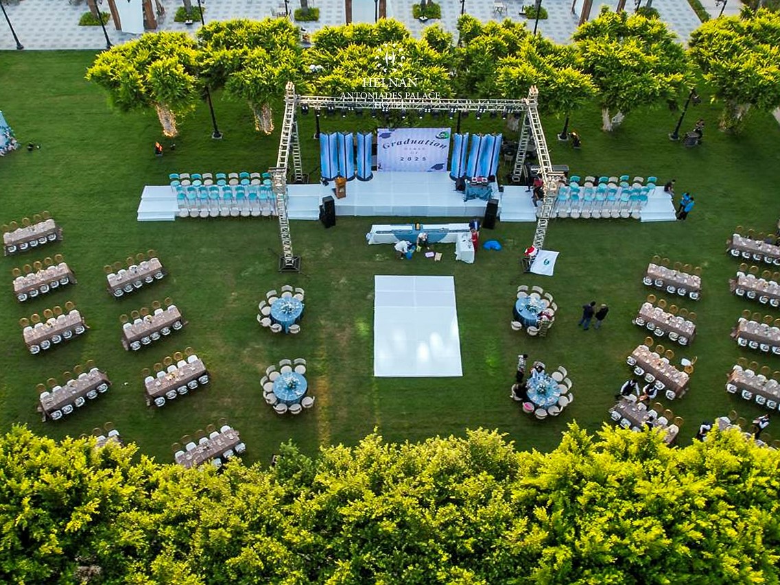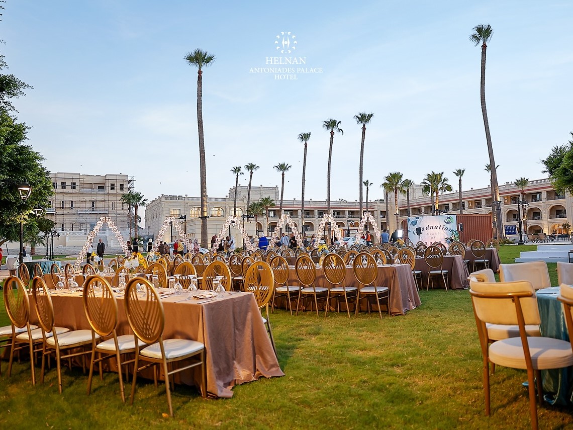 قاعة الأفراح الأوبن إير في فندق هلنان أنطونيادس بالاس بتوفر أجواء راقية ومميزة لحفل زفاف استثنائي أمام حمام السباحة، حيث الطبيعة والفخامة في مكان واحد.