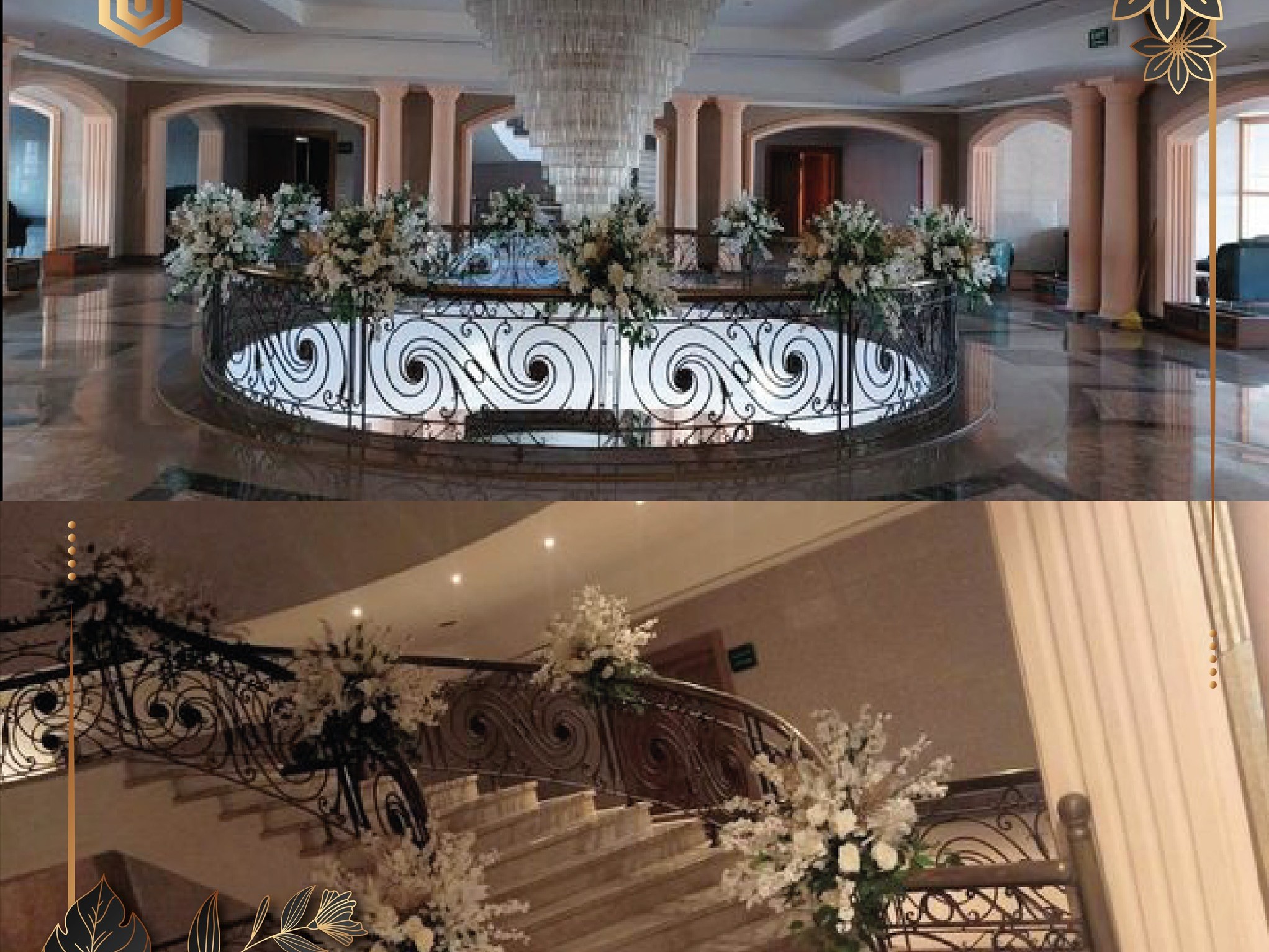 • سلم دائري أنيق ومدخل رئيسي مجهز بالورد
