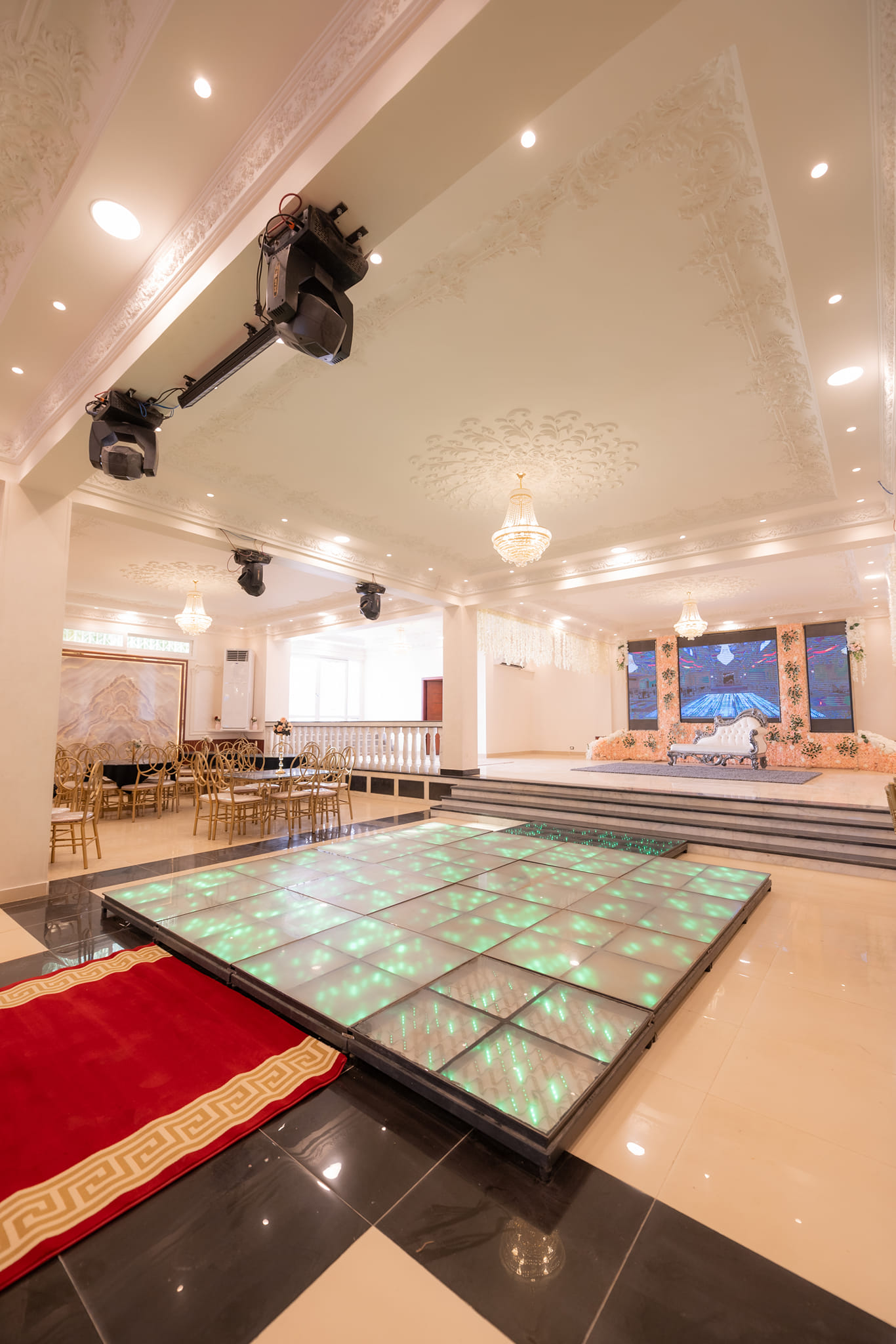 القاعة مناسبة للأفراح الراقية والمناسبات اللي محتاجة تنظيم هادي وشكل أنيق، مع إضاءة مدروسة تبرز جمال الديكور.