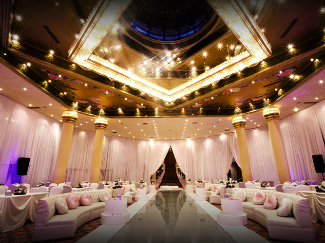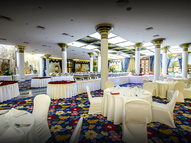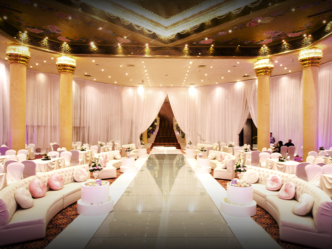 طابع ملكي فخم بتصاميم وزخارف راقية للجدران والأسقف، أرضيات رخامية، ثريات كريستالية تزين القاعة، مسرح كبير مع كوشة أنيقة، وممر زفة مرتفع يخطف الأنظار.