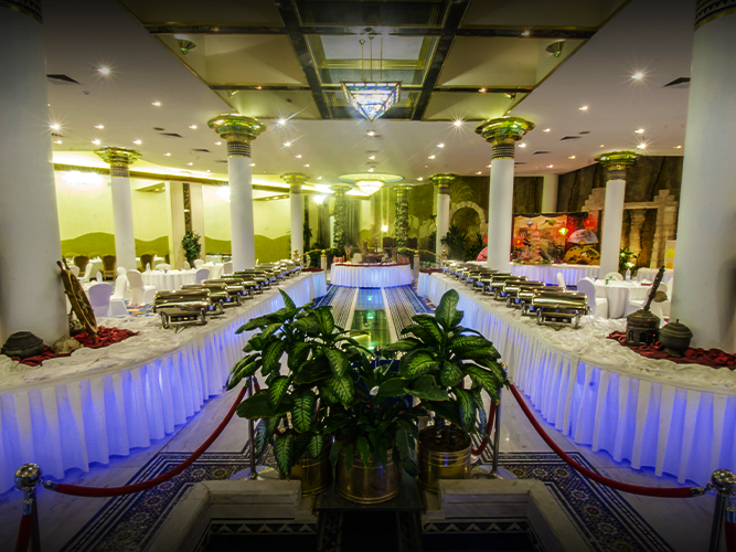 تشكيلة من أشهى الأطباق الشرقية والغربية، مع حلويات متنوعة ومشروبات بكل الأنواع.