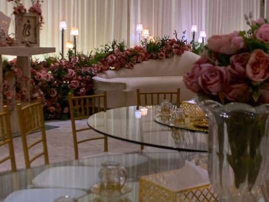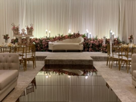قاعة زاهية مجهزة بأجواء ساحرة وديكورات فخمة تلفت النظر، وتناسب حفلات الزفاف، الملكه، التخرج، وأعياد الميلاد.