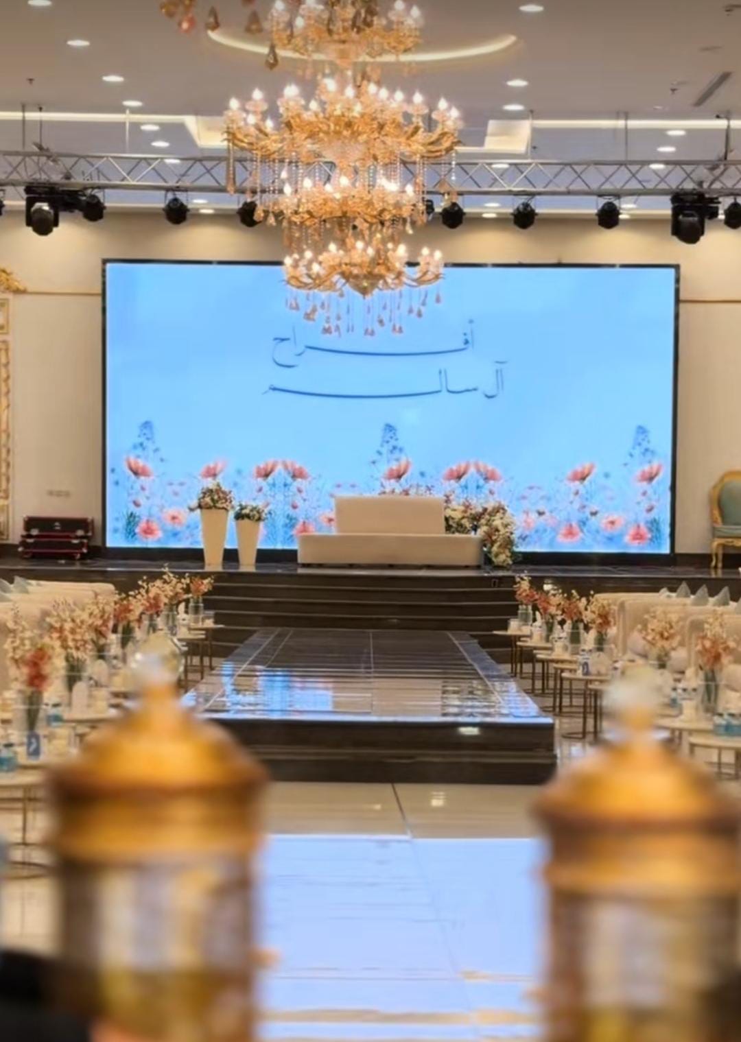 ممر مخصص للزفة، منصة كوشة مميزة، وإضاءات حديثة تعطي أجواء مناسبة لكل فقرة من فقرات الحفل.
